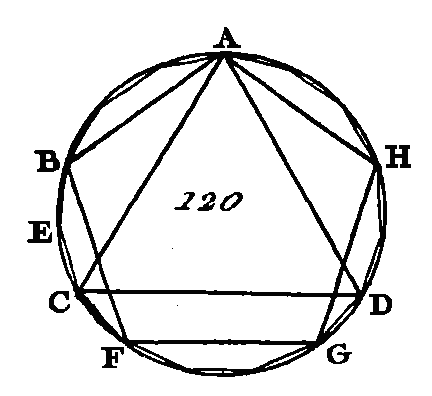 Puisque le point G est le centre du cercle ABCDEF, la droite GE sera égale à la droite GD. De plus, puisque le point D est le centre du cercle EGCH, la droite DE sera égale à la droite DG ; mais on a démontré que la droite GE est égale à la droite GD : donc la droite GE est égale à la droite ED : donc le triangle EGD est équilatéral : donc ses trois angles EGD, GDE, DEG sont égaux entre eux, puisque dans les triangles isocèles les angles à la base sont égaux entre eux (prop. 5. I) ; mais les trois angles d'un triangle sont égaux à deux droits (prop. 32. I) : donc l'angle EGD est le tiers de deux angles droits. On démontrera semblablement que l'angle DGC est le tiers de deux angles droits ; donc, puisqu'une droite CG tombant sur la droite EB fait les angles de suite EGC, CGB égaux à deux droits (prop. 13. I), l'angle restant CGB sera le tiers de deux angles droits : donc les angles EGD, DGC, CGB sont égaux entre eux; mais les angles BGA, AGF, FGE sont égaux aux angles EGD, DGG, CGB, parce que ces angles sont opposés par le sommet (prop. 15. I): donc les six angles EGD, DGC, CGB, BGA, AGF, FGE sont égaux entre eux; mais des angles égaux s'appuient sur des arcs égaux (prop. 26. III) : donc les six arcs AB, BC, CD, DE, EF, FA sont égaux entre eux ; mais des arcs égaux sont sous-tendus par des cordes égales (prop. 29. III) : donc les six cordes sont égales entre elles : donc l'hexagone ABCDEF est équilatéral. Je dis qu'il est équiangle, car puisque l'arc AF est égal à l'arc ED, si nous leur ajoutons à chacun l'arc ABCD, l'arc total FABCD sera égal à l'arc total EDCBA : donc, puisque l’angle FED s'appuie sur l'arc FABCD et que l'angle AFE s'appuie sur l'arc EDCBA, l'angle AFE est égal à l'angle DEF (prop. 27. III). On démontrera semblablement que les autres angles de l'hexagone ABCDEF sont égaux chacun à l'un ou à l'autre des angles AFE, FED : donc l'hexagone ABCDEF est équiangle. Mais on a démontré qu'il est équilatéral, et il est inscrit dans le cercle ABCDEF. Donc on a inscrit un hexagone équilatéral et équiangle dans un cercle donné; ce qu'il fallait faire. Il suit manifestement de là que le côté de l'hexagone est égal au demi-diamètre du cercle. Si par les points A, B, C, D, E, F nous menons des tangentes au cercle, on circonscrira à ce cercle un hexagone équilatéral et équiangle en suivant la méthode que nous avons donnée pour le pentagone ; c'est aussi de la même manière que nous inscrirons et que nous circonscrirons une circonférence de cercle à un hexagone donné. PROPOSITION XVI.PROBLÈME.Inscrire dans un cercle donné un quindécagone équilatéral et équiangle. Soit ABCD (fig. 120) le cercle donné : il faut dans ce cercle inscrire un quindécagone équilatéral et équiangle.