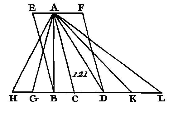 LIVRE VI.DÉFINITIONS.1. Les figures rectilignes semblables sont celles dont les angles sont égaux chacun à chacun et dont les côtés placés autour des angles égaux sont proportionnels. 2. Les figures sont réciproques lorsque les antécédents et les conséquents des raisons se trouvent dans l'une et l'autre figure. 3. Une droite est dite coupée en extrême et moyenne raison lorsque la droite totale est au plus grand segment comme le plus grand segment est au plus petit. 4. La hauteur d'une figure est une perpendiculaire menée de son sommet sur sa base. 5. On dit qu'une raison est composée de raisons lorsque les quantités des raisons multipliées entre elles produisent la quantité de cette raison. PROPOSITION PREMIÈRE.THÉORÈME.Les triangles et les parallélogrammes qui ont la même hauteur sont entre eux comme leurs bases. Soient les triangles ABC, ACD (fig. 121) et les parallélogrammes EC, CF qui ont la même hauteur, savoir, la perpendiculaire menée du point A sur la droite BD : je dis que le triangle ABC est au triangle ACD et que le parallélogramme EC est au parallélogramme CF comme la base BC est à la base CD. Prolongez la droite BD de part et d'autre vers les points H, L, et faites les droites BG, GH égales chacune à la base B C ; faites aussi les droites DK, KL égales chacune à la base CD, et menez les droites AG, AH, AK, AL.