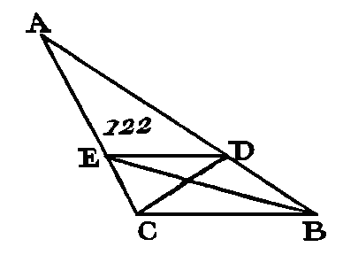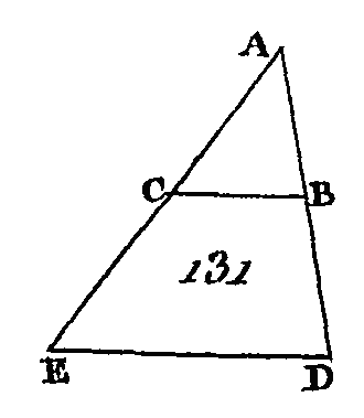 Puisque les droites CB, BG, GH sont égales entre elles, les triangles AGH, AGB, ABC seront égaux entre eux (prop. 38. I) : donc le triangle AHC contient le triangle ABC autant de fois que la base HC contient la base BC. Par la même raison le triangle ALC contient le triangle ACD autant de fois que la base LC contient la base CD. Si la base HC est égale à la base CL, le triangle AHC sera égal au triangle ABC (prop. 38. I) ; si la base HC surpasse la base CL, le triangle AHC surpassera le triangle ALC, et si cette base est plus petite le triangle sera plus petit. Ayant donc quatre quantités, savoir, les deux bases BC, CD et, les deux triangles ABC, ACD, on a pris des équimultiples de la base BC et du triangle ABC, savoir, la base HC et le triangle AHC ; on a pris aussi d'autres équimultiples de la base CD et du triangle ACD, savoir, la base CL et le triangle ALC ; et l'on a démontré que si la base HC surpasse la base CL, le triangle AHC surpassera le triangle ALC; que si la base HC est égale à la base CL, le triangle AHC sera égal au triangle ALC, et que si la base HC est plus petite que la base GL, le triangle AHC sera plus petit que le triangle ALC : donc le triangle ABC est au triangle ACD comme la base BC et la base CD (déf. 5. 5). Puisque le parallélogramme EC est double du triangle ABC, que le parallélogramme FC est double aussi du triangle ACD (prop. 41. I), et à cause que les parties ont entre elles la même raison que leurs équimultiples (prop. 15. V), le parallélogramme EC sera un parallélogramme FC comme le triangle ABC est un triangle ACD : donc puisqu'on a démontré que le triangle ABC est au triangle ACD comme la base BC est à la base CD; et à cause que le parallélogramme EC est au parallélogramme FC comme le triangle ABC est au triangle ACD, le parallélogramme EC sera au parallélogramme FC comme la base BC est à la base CD (prop. 11. V). Donc les triangles et les parallélogrammes qui ont la même hauteur sont entre eux comme leurs bases ; ce qu'il fallait démontrer. PROPOSITION II.THÉORÈME.Si l’on conduit une droite qui soit parallèle à un des côtés d'un triangle, cette droite coupera proportionnellement les côtés de ce triangle; et si deux côtés d'un triangle sont coupés proportionnellement, la droite qui joindra les sections sera parallèle au côté restant du triangle. Que l'on mène la droite DE (fig. 122) de manière qu'elle soit parallèle à un des côtés du triangle ABC : je dis que CE est à EA comme BD est à DA. Menez les droites BE, CD.