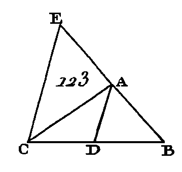 Le triangle BDE est égal au triangle CDE (prop. 37. I), parce qu'ils ont la même base et qu'ils sont compris entre les mêmes parallèles. Mais deux quantités égales ont la même raison avec une même quantité (prop. 7. V) : donc le triangle CDE est au triangle ADE comme le triangle BDE est au triangle ADE. Mais le triangle BDE est au triangle ADE comme BD est à DA : car ces deux triangles, qui ont la même hauteur, savoir, la perpendiculaire menée du point E sur la base AB, sont entre eux comme leurs bases (prop. 1. VI). Par la même raison le triangle CDE est au triangle ADE comme CE est à EA : donc BD est à DA comme CE est à EA (prop. 11. V). Si les côtés AB, AC du triangle ABC sont coupés proportionnellement aux points D, E de manière que BD soit à DA comme CE est à EA, et si l'on mène la droite DE : je dis que la droite DE est parallèle à la droite BC. Faites la même construction. Puisque BD est à DA comme CE est à EA, que BD est à DA comme le triangle BDE est au. triangle ADE (prop. 1. VI), et que CE est à EA comme le triangle CDE est au triangle ADE; le triangle BDE sera au triangle ADE comme le triangle CDE est au triangle ADE (prop. 11. V) : donc chacun des triangles BDE, CDE a la même raison avec le triangle ADE : donc le triangle BDE est égal au triangle CDE (prop. 9, V), et ils ont la même base. Mais des triangles égaux et construits sur la même base sont compris entre les mêmes parallèles (prop. 39. I) : donc la droite DE est parallèle à la droite BC. Donc si l'on conduit une droite qui soit parallèle à un des côtés d'un triangle, cette droite coupera proportionnellement les côtés de ce triangle ; et si les côtés d'un triangle sont coupés proportionnellement, la droite qui joindra les sections sera parallèle au côté restant de ce triangle ; ce qu'il fallait démontrer. PROPOSITION III.THÉORÈME.Si un angle d’un triangle est partagé en deux parties égales, et si la droite qui partage cet angle coupe la base, les segments de la base auront la même raison que les autres côtés de ce triangle ; et si les segments de la hase ont la même raison que les autres côtés du triangle, la droite qui est menée du sommet à la section partagera l'angle de ce triangle en deux parties égales. Soit le triangle ABC (fig. 123), que l'angle BAC soit partagé en deux parties égales par la droite AD : je dis que BD est à DC comme BA est à AC. Par le point C menez la droite CE parallèle à la droite DA (prop. 31. I) ; prolongez la droite BA jusqu'à ce qu'elle rencontrera la droite CE au point E.