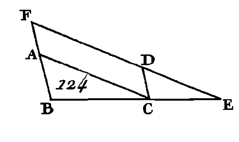 Puisque la droite AC tombe sur les parallèles AD, EC, l'angle ACE sera égal à l'angle CAD (prop. 29. I) ; mais l'angle CAD est supposé égal à l'angle BAD : donc l'angle BAD sera égal à l'angle ACE. De plus, puisque la droite BAE tombe sur les parallèles AD, EC, l'angle extérieur BAD est égal à l'angle intérieur AEC (prop. 29. I). Mais on a démontré que l'angle ACE est égal à l'angle BAD : donc l'angle ACE sera égal à l'angle AEC : donc le côté AE sera égal au côté AC (prop. 6. I). Puisque la droite AD est parallèle à un des côtés du triangle BCE, savoir, au côté EC, la droite BD sera à la droite DC comme la droite BA est à la droite AE (prop. 2. VI). Mais la droite AE est égale à la droite AC : donc la droite BD est à la droite DC comme la droite BA est à la droite AC (prop. 7. V). Supposons à présent que la droite BD soit à la droite DC comme la droite BA est à la droite AC ; menez la droite AD : je dis que l'angle BAC est partagé en deux parties égales par la droite AD. Faites la même construction. Puisque BD est à DC comme BA est à AC, et que BD est à DC comme BA. est à AE (prop. 2. VI), car la droite AD est parallèle à un des côtés du triangle BCE, savoir au côté EC, il est évident que BA sera à AC comme BA est à AE : donc la droite AC est égale à la droite AE (prop. 9. V) : donc l'angle AEC est égal à l'angle ACE (prop. 5, I); mais l'angle AEC est égal à l’angle extérieur BAD (prop. 29. I), et l'angle ACE égal à l'angle alterne CAD : donc l'angle BAD sera égal à l'angle CAD : donc l'angle BAC est partagé en deux parties égales par la droite AD. Donc si un angle d'un triangle est partagé en deux parties égales, et si la droite qui partage cet angle coupe la base, les segments de la base auront la même raison que les autres côtés de ce triangle ; et si les segments de la base ont la même raison que les autres côtés du triangle, la droite qui est menée du sommet à la section de la base partage l’angle de ce triangle en deux parties égales ; ce qu'il fallait démontrer. PROPOSITION IV.THÉORÈME.Dans les triangles équiangles, les côtés qui sont autour des angles égaux sont proportionnels ; et on appelle côtés homologues ceux qui sous-tendent des angles égaux. Soient les triangles équiangles ABC, DCE (fig. 124) dont l'angle ABC soit égal à l'angle DCE, l'angle ACB égal à l'angle DEC, et l'angle BAC égal à l'angle CDE : je dis que dans les deux triangles ABC, DCE, les côtés qui sont autour des angles égaux sont proportionnels, et que les côtés qui sous-tendent des angles égaux sont homologues.