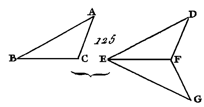 Placez le côté BC dans la direction de CE; puisque les angles ABC, ACB sont moindres que deux angles droits (prop. 17. I), et que l'angle ACB est égal à l'angle DEC, les angles ABC, DEC seront plus petits que deux angles droits : donc les deux droites BA, ED étant prolongées se rencontreront entre elles (ax. 11) et supposons qu'elles se rencontrent au point F. Puisque l'angle DCE est égal à l'angle ABC, la droite DC sera parallèle à la droite BF (prop. 28. I). De plus, puisque l'angle ACB est égal à l'angle DEC, la droite AC sera parallèle à la droite FE. Donc la figure FACD est un parallélogramme : donc la droite FA est égale à la droite FD et la droite AC égale à la droite FD (prop. 34. I) et puisqu'un des côtés du triangle FBE, savoir, le côté AC est parallèle au côté FE, le côté BA sera au côté AF comme le côté BC est au côté CE (prop. 2. VI). Mais la droite AF est égale à la droite CD ; donc BA est à CD comme BC est à CE (prop. 7. V), et, en alternant, AB est à BC comme CD est à CE (prop. 16. V). De plus, puisque la droite CD est parallèle à la droite BF, la droite BC sera à la droite CE comme la droite FD est à la droite DE. Mais la droite DF est égale à la droite AC : donc BC est à CE comme AC est à ED, et en alternant, BC est à CA comme CE est à ED; mais puisqu'on a démontré que AB, est à BC comme DC est à CE, et que BC est à CA comme CE est à ED, la droite BA sera à la droite AC comme CD est à DE (prop. 23. V). Donc dans les triangles équiangles les côtes qui sont autour des angles égaux sont proportionnels, et les côtés qui sous-tendent des angles égaux sont homologues ; ce qu'il fallait dé montrer. PROPOSITION V.THÉORÈME.Si deux triangles ont leurs côtés proportionnels, ces deux triangles seront équiangles et les angles sous-tendus par les côtés homologues seront égaux. Soient deux triangles ABC, DEF (fig. 125) dont les côtés soient proportionnels, de manière que AB soit à BC comme DE est à EF, que BC soit à CA comme EF est à FD et que BA soit à AC comme ED est à DF : je dis que les triangles ABC, DEF sont équiangles et que les angles sous-tendus par les côtés homologues sont égaux, savoir, l'angle ABC égal à l'angle DEF, l'angle BCA égal à l'angle EFD, et enfin l'angle BAC égal à l'angle EDF.