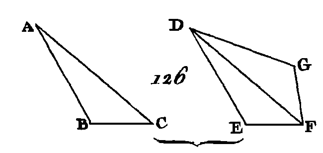 Construisez sur la droite EF et aux points E, F l'angle FEG égal à l'angle ABC et l'angle EFG égal à l'angle BCA (prop. 25. I) ; le troisième angle BAC sera égal au troisième angle ÉGF (prop. 32. I) : donc les triangles ABC, EGF sont équiangles : donc dans les deux triangles ABC, EGF, les côtés qui sont autour des angles égaux sont proportionnels et les côtés qui sous-tendent les angles égaux sont homologues (prop. 4. VI) : donc AB est à BC comme GE est à EF, mais AB est à BC comme DE est à EF : donc DE est à EF comme GE est à EF (prop. 11. V) : donc l'une et l'autre des droites DE, GE ont la même raison avec la droite EF : donc la droite DE est égale à la droite GE (prop. 9. V). La droite DF sera égale à la droite GF, par la même raison. Donc, puisque la droite EG est égale à la droite DE, et que la droite EF est commune, les deux droites DE, EF sont égales aux deux droites GE, EF ; mais la base DF est égale à la base GF : donc l'angle DEF est égal à l'angle GEF (prop. 8. I); donc le triangle DEF est égal au triangle GEF et les autres angles qui sont sous-tendus par les côtés égaux sont encore égaux : donc l'angle DFE est égal à l'angle GFE et l'angle EDF égal à l'angle EGF. Puisque DEF est égal à l'angle GEF et que l'angle GEF est égal à l'angle ABC, par construction, l'angle ABC sera égal à l'angle DEF. Par la même raison l'angle ACB sera égal à l'angle DFE et l'angle A égal à l'angle D : donc les triangles ABC, DEF sont équiangles. Donc si deux triangles ont leurs côtés proportionnels, ces deux triangles seront équiangles, et les angles sous-tendus par les côtés homologues seront égaux ; ce qu'il fallait démontrer. PROPOSITION VI.THÉORÈME.Si deux triangles ont un angle égal à un angle, et si les côtés qui sont autour des angles égaux sont proportionnels, ces deux triangles seront équiangles et les angles sous-tendus par les côtés homologues seront égaux. Soient les deux triangles ABC, DEF (fig. 126), ayant un angle BAC égal à un angle EDF, et ayant de plus les côtés qui sont autour des angles égaux proportionnels entre eux, de manière que BA soit à AC comme ED est à DF : je dis que les triangles ABC, DEF sont équiangles et que l'angle ABC est égal à l'angle DEF et l'angle ACB égal à l'angle DFE.