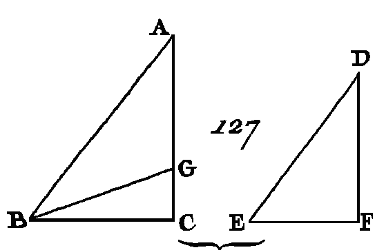 Sur la droite DF et aux points D, F construisez l'angle FDG égal à l'un ou à l'autre des angles BAC, EDF et l'angle DFG égal à l'angle ACB (prop. 23. I). L'angle restant B sera égal à l'angle restant G (prop. 32. I) : donc les triangles ABC, DGF sont équiangles : donc B A est à AC comme GD est à DF (prop. 4. VI) ; mais on suppose que BA est à AC comme ED est à DF : donc ED est à DF comme GD est à DF (prop. 11. V) : donc le côté ED est égal au côté DG (prop. 9. V); mais le côté DF est commun : donc les deux droites ED, DF sont égales aux deux droites GD, DF; mais l'angle EDF est égal à l'angle GDF : donc la base EF est égale à la base FG (prop. 4. I) donc le triangle DEF égal au triangle GDF et les autres angles qui sont sous-tendus par les côtés égaux sont encore égaux : donc l'angle DFG est égal à l'angle DFE et l'angle G égal à l'angle E. Mais l'angle DFG est égal à l'angle ACB, par construction : donc l'angle ACB est égal à DFE; mais l'angle BAC est supposé égal à l'angle EDF : donc l'angle restant B est égal à l'angle restant E (prop. 32. I) : donc les deux triangles ABC, DEF sont équiangles. Donc si deux triangles ont un angle égal à un angle, et si les côtés qui sont autour des angles égaux sont proportionnels, ces deux triangles seront équiangles, et les angles sous-tendus par les côtés homologues seront égaux ; ce qu'il fallait démontrer. PROPOSITION VII.THÉORÈME.Si deux triangles ont un angle égal à un angle, si les côtés placés autour de deux autres angles sont proportionnels entre eux, et si chacun des angles restons est en même temps ou plus petit ou n'est pas plus petit qu'un angle droit, les triangles seront équiangles et les angles adja-cens aux côtés proportionnels seront égaux. Soient les deux triangles ABC, DEF (fig. 127) ayant un angle égal à un angle, savoir, l'angle BAC égal à l'angle EDF et les côtés qui sont autour de deux autres angles ABC, DEF proportionnels entre eux, de manière que DE soit à EF comme AB est à BC, et que chacun des deux autres angles ACB, DFE soit plus petit qu'un angle droit : je dis que les triangles ABC, DEF sont équiangles, que l'angle ABC est égal à l'angle DEF, et l'angle ACB égal à l'angle DFE.