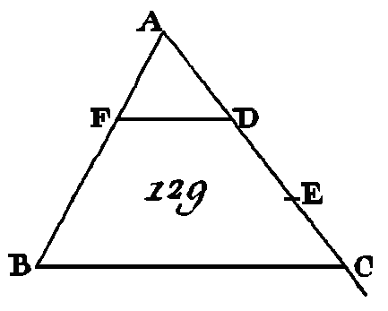 Car puisque l'angle BAC est égal à l'angle ADB, étant droits l'un et l'autre, et que l'angle B est commun aux deux triangles ABC, ABD, l'angle restant ACB sera égal à l'angle restant BAD (prop. 32. I) : donc les deux triangles ABC, ABD sont équiangles : donc le côté BC qui sous-tend l'angle droit du triangle ABC, est au côté BA qui sous-tend l'angle droit du triangle ABD comme le côté AB qui sous-tend l'angle C du triangle ABC, est au côté BD qui sous-tend un angle égal à l'angle C, c'est-à-dire l'angle BAD du triangle ABD, et enfin comme le côté AC est au côté AD qui soutend un angle B commun à ces deux triangles : donc les triangles ABC, ABD sont équiangles, et les côtés placés autour à des angles égaux sont proportionnels entre eux (prop. 4. VI) : donc le triangle ABC est semblable au triangle ABD (déf. 1. VI). Nous démontrerons que de même le triangle ADC est semblable au triangle ABC : donc chacun des triangles ABD, ADC est semblable au triangle total ABC. Je dis de plus que les triangles ABD, ADC sont semblables entre eux. Car puisque l'angle droit BDA est égal à l'angle droit ADC, et à cause qu'il a été dé montré que l'angle BAD est égal à l'angle C, l'angle restant B sera égal à l'angle restant DAC (prop. 32. I) : donc les deux triangles ABD, ADC sont équiangles : donc le côté BD du triangle ABD, qui sous-tend l'angle BAD est au côté DA du triangle ADC, qui sous-tend l'angle C égal à l'angle BAD, comme le côté AD du triangle ABD qui sous-tend l'angle B est au côté DC du triangle ADC qui sous-tend l'angle DAC égal à l'angle B, et comme le côté BA qui soutend l'angle droit ADB est au côté AC qui soutend l’angle droit ADC (prop. 4. VI) : donc le triangle ABD est semblable au triangle ADC (déf. 1. VI). Donc si dans un triangle rectangle, on conduit une perpendiculaire de l'angle droit sur la base, les triangles placés autour de la perpendiculaire sont semblables au triangle total et semblables entre eux ; ce qu'il fallait démontrer. COROLLAIRE.Il suit de là que, dans un triangle rectangle la perpendiculaire conduite de l'angle droit, sur la base, est moyenne proportionnelle entre les segments de la base, et que chaque côté de l'angle droit est moyen proportionnel entre la base et le segment qui lui est contigu. PROPOSITION IX.PROBLÈME.D'une droite donnée retrancher une partie demandée. Soit AB (fig. 129) la droite donnée : il faut de la droite AB retrancher une partie demandée. Que la partie demandée soit le tiers de cette droite du point A conduisez une droite quelconque AC qui fasse avec la droite AB un angle quelconque ; prenez sur la droite À C un point quelconque D et faites les droites DE, EC égales chacune à la droite AD (prop. 3. I); conduisez ensuite la droite BC et par le point D conduisez la droite DF parallèle à la droite BC (prop. 31. I).