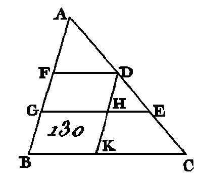 Puisqu'on a conduit la droite FD parallèle à un des côtés du triangle ABC, savoir, au côté BC, la droite CD sera à la droite DA comme la droite BF est à la droite FA (prop. 2. VI); mais la droite CD est double de la droite DA : donc la droite BF est double de la droite FA : donc la droite BA est double de la droite AF. Donc on a retranché de la droite donnée AB sa troisième partie demandée ; ce qu'il fallait faire. PROPOSITION X.PROBLÈME.Partager une droite donnée qui n'est point partagée de la même manière qu'une autre droite donnée est partagée. Soit AB (fig. 130) la droite donnée qui n'est point partagée et AC la droite donnée qui est partagée: il faut partager la droite AB qui n'est pas partagée de la même manière que la droite AC est partagée. Que la droite AC soit partagée aux points D, E, et que les droites AC, AB soient placées de manière qu'elles comprennent un angle quelconque. Conduisez la droite BC, et par les points D, E, conduisez les droites DF, EG parallèles à la droite BC (prop. 31. I), et par le point D conduisez la droite DHK parallèle à la droite AB.