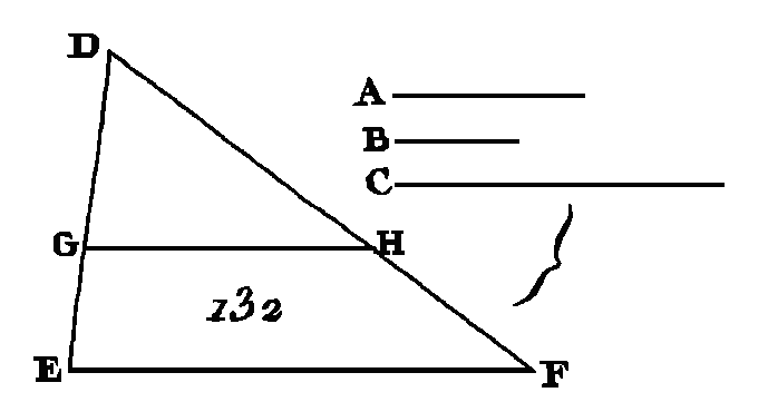Prolongez les droites AB, AC vers les points D, E; faites la droite BD égale à la droite AC; menez la droite BC, et, par le point D, menez la droite DE parallèle à la droite BC (prop. 31. I). Puisque la droite BC est parallèle à un des côtés du triangle ADE, savoir au côté DE, la droite AB sera à la droite BD comme la droite AC est à la droite CE (prop. 2. VI); mais la droite BD est égale à la droite AC : donc la droite AB est à la, droite AC comme la droite AC est à la droite CE. Donc les deux droites AB, AC ayant été, données, on a trouvé une troisième proportionnelle CE; ce qu'il fallait faire. PROPOSITION XII.PROBLÈME.Trois droites étant données, trouver une quatrième proportionnelle. Soient A, B, C (fig. 132), les trois droites données, il faut trouver une quatrième proportionnelle aux trois droites A, B, C. Menez les deux droites DE, DF, comprenant un angle quelconque EDF ; faites la droite DG égale à la droite A, la droite GE égale à la droite B et la droite DH égale à la droite C. Menez la droite GH, et par le point E menez la droite EF parallèle à la droite GH.
