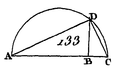 Puisque la droite GH est parallèle à un des côtés du triangle DEF, savoir au côté EF, la droite DG sera à la droite GE comme la droite DH est à la droite HF (prop. 2. VI). Mais la droite DG est égale à la droite A, la droite GE égale à la droite B, et la droite DH égale à la droite C : donc la droite A est à la droite B comme la droite C est à la droite HF. Donc trois droites A, B, C étant données, on a trouvé, une quatrième proportionnelle HF ; ce qu'il fallait faire. PROPOSITION XIII.PROBLÈME.Deux droites étant données, trouver une moyenne proportionnelle. Soient AB, BC (fig. 133) les deux droites données ; il faut trouver une moyenne proportionnelle entre ces deux droites.