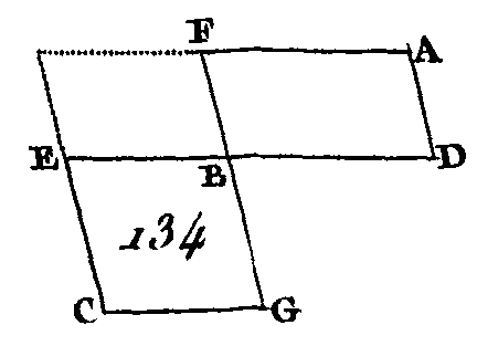 Placez ces deux droites dans la même direction, et sur la droite AC décrivez le demi-cercle ADC, du point B élevez la perpendiculaire AC et menez les droites AD, DC (prop. 11. I). Puisque l'angle ADC est dans un demi-cercle, cet angle est droit (prop. 31. III); et puisque dans le triangle rectangle ADC on a conduit de l’angle droit la droite DB perpendiculaire sur la base, la droite DB sera moyenne proportionnelle entre les segments de la base AB, BC (corrol. 8. VI). Donc les deux droites AB, BC ayant été données, on a trouvé une moyenne proportionnelle DB; ce qu'il fallait faire. PROPOSITION XIV.PROBLÈME.Si deux parallélogrammes égaux ont un angle égal à un angle, les côtés qui sont placés autour des angles égaux sont réciproquement proportionnels ; et si deux parallélogrammes ont un angle égal à un angle, et si les cotés qui sont placés autour des angles égaux sont réciproquement proportionnels, ces deux parallélogrammes sont égaux entre eux. Soient AB, BC (fig. 134) deux parallélogrammes égaux, ayant deux angles égaux en B. Placez la droite BE dans la direction de DB; la droite BC sera dans la direction de FB (prop. 14. I) : je dis que les côtés des parallélogrammes AB, BC qui sont placés autour des angles égaux sont réciproquement proportionnels, c'est-à-dire que DB est à BE comme GB est à BF.