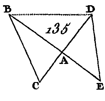 Achevez le parallélogramme FE. Puisque le parallélogramme AB est égal au parallélogramme BC et que EF est un troisième parallélogramme, AB sera à FE comme BC est à FE (prop. 7. V); mais AB est à FE comme DB est à BE (prop. 1. VI); et BC est à FE comme GB est à BF : donc DB est à BE comme GB est à BF (prop. 11. V) : donc les côtés des parallélogrammes AB, BC qui sont autour des angles égaux sont réciproquement proportionnels. Supposons à présent que les côtés qui sont autour des angles égaux soient réciproquement proportionnels, c'est-à-dire que DB soit à BE comme GB est à BF : je dis que le parallélogramme AB est égal au parallélogramme BC. Puisque DB est à BE comme GB est à BF que DB est à BE comme le parallélogramme AB est au parallélogramme FE (prop. 1. VI), et que GB est à BF comme le parallélogramme BC est au parallélogramme FE, AB sera à FE comme BG est à FE (prop. 11. V) : donc le parallélogramme AB est égal au parallélogramme BC. (prop. 9. V). Donc si deux parallélogrammes égaux ont un angle égal à un angle, les côtés qui sont autour des angles égaux sont réciproquement proportionnels ; et si deux parallélogrammes ont un angle égal à un angle, et si les côtés qui sont autour des angles égaux sont réciproquement proportionnels, ces deux parallélogrammes sont égaux; ce qu'il fallait démontrer. PROPOSITION XV.THÉORÈME.Si deux triangles égaux ont un angle égal à un angle, les côtés placés autour des angles égaux sont réciproquement proportionnels ; et si deux triangles ont un angle égal à un angle, et si les côtés placés autour de ces angles égaux sont réciproquement proportionnels, ces deux triangles sont égaux entre eux. Soient ABC, ADE (fig. 135) des triangles égaux, ayant un angle égal à un angle, savoir, l'angle BAC égal à l'angle DAE : je dis que les côtés des triangles ABC, ADE placés autour des angles égaux sont réciproquement proportionnels entre eux, c'est-à-dire que CA est à AD comme EA est à AB.