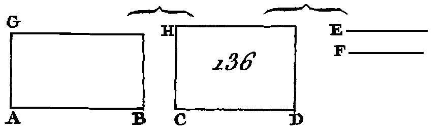 Placez ces triangles de manière que la droite CA soit dans la direction de la droite AD; la droite EA sera dans la direction de la droite AB (prop. 14. I). Menez la droite BD. Puisque le triangle ABC est égal au triangle ADE et que ABD est un autre triangle, le-triangle CAB sera au triangle BAD comme le triangle ADE est au triangle BAD (prop. 7. V) ; mais le triangle CAB est au triangle BAD comme CA est à AD (prop. 1. VI), et le triangle EAD est au triangle BAD comme EA est à AB : donc CA est à AD comme EA est à AB (prop. 11. V) : donc les côtés des triangles ABC, ADE, qui sont autour des angles égaux, sont réciproquement proportionnels. Supposons à présent que les côtés des triangles ABC, ADE soient réciproquement proportionnels, c'est-à-dire que CA soit à AD comme EA est à AB : je dis que le triangle ABC l’est égal au triangle ADE. Menez BD. Puisque CA est à AD comme EA est à AB, que CA est à AD comme le triangle ABC est au triangle BAD (prop. 1. VI), et que EA est à AB comme le triangle EAD est au triangle BAD, le triangle ABC sera au triangle BAD comme le triangle EAD est au triangle BAD (prop. 11. V) : donc l'un et l'autre des triangles ABC, ADE ont la même raison avec le triangle BAD : donc le triangle ABC est égal au triangle EAD (prop. 9. V). Donc si deux triangles égaux ont un angle égal a un angle, les côtés placés autour de ces angles égaux sont réciproquement proportionnels ; et si deux triangles ont un angle égal à un angle, et si les côtés placés autour des angles égaux sont réciproquement proportionnels, ces deux triangles seront égaux ; ce qu'il fallait démontrer. PROPOSITION XVI.THÉORÈME.Si quatre droites sont proportionnelles, le rectangle compris sous les deux droites extrêmes est égal au rectangle qui est compris sous les deux droites moyennes ; et si le rectangle compris sous deux droites extrêmes est égal à celui qui est compris sous deux droites moyennes, ces quatre droites sont proportionnelles. Soient AB, CD, E, F (fig. 136) quatre droites proportionnelles de manière qu'on ait AB est à CD comme E est à F : je dis que le rectangle compris sous les droites AB, F est égal au rectangle compris sous les droites CD, E. Des points A, C et sur les droites AB, CD élevez les perpendiculaires AG, CH (prop. 11. I), faites la droite AG égale à la droite F et la droite CH égale à la droite E, et terminez les parallélogrammes BG, DH.