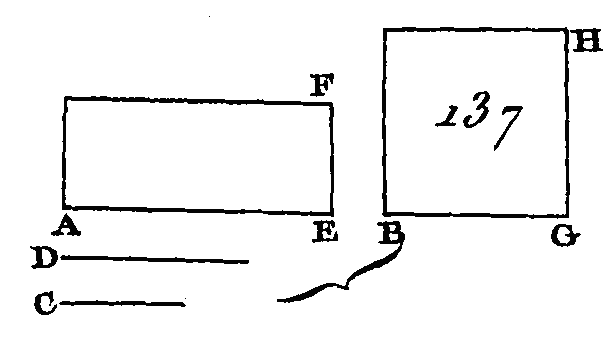Puisque AB est à CD comme E est à F et que E est égal à CH et F égal à AG, AB sera à CD comme CH est à AG (prop. 7. V) : donc les côtés des parallélogrammes BG, DH placés autour des angles égaux sont, réciproquement, proportionnels ; mais lorsque les côtés des parallélogrammes équiangles qui sont autour des angles égaux sont réciproquement proportionnels, ces parallélogrammes sont égaux entre eux (prop. 14. VI) : donc le parallélogramme BG est égal au parallélogramme DH, mais le parallélogramme BG est compris sous les droites AB, F ; car AG est égal à F, et le parallélogramme DH est compris sous les droites CD, E ; puisque CH est égal à E : donc le rectangle compris sous les droites AB, F est égal à celui qui est compris sous les droites CD, E. Si le rectangle compris sous les droites AB, F est égal à celui qui est compris sous les droites CD, E : je dis que ces quatre droites sont proportionnelles, c'est-à-dire que AB est à CD comme E est à F. Faites la même construction ; le rectangle compris sous les droites AB, F est égal à celui qui est compris sous les droites CD, E ; mais le, rectangle BG est compris sous les droites AB, F ; car AG est égal à F et le rectangle DH est compris sous les droites CD, E, car CH est égal à E : donc le parallélogramme BG est égal au parallélogramme DH et ces deux parallélogrammes sont équiangles. Mais les côtés des parallélogrammes égaux et équiangles placés autour des angles égaux sont réciproquement proportionnels (prop. 14. VI) : donc AB est à CD comme CH est à AG; mais CH est égal à E et AG égal à F : donc AB est à CD comme E est à F. Donc si quatre droites sont proportionnelles, le rectangle compris sous les droites extrêmes est égal au rectangle compris sous les droites moyennes ; et si un rectangle compris sous deux droites extrêmes est égal à un rectangle compris sous deux droites moyennes, ces quatre droites sont, proportionnelles ; ce qu'il fallait démontrer. PROPOSITION XVII.THÉORÈME.Si trois droites sont proportionnelles, le rectangle compris sous les droites extrêmes est égal au carré de la droite moyenne; et si un rectangle compris sous deux droites extrêmes est égal au carré d'une droite moyenne, ces trois droites sont proportionnelles. Soient AE, BG, C (fig. 137) trois droites proportionnelles, de manière que l'on ait AE est à BG comme BG est à C : je dis que le rectangle compris sous les droites AE, C est égal au carré de BG. Faites la droite D égale à la droite BG.