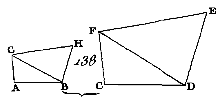 Puisque AE est à BG comme BG est à C et que BG est égal à D, la droite AE sera à la droite BG comme la droite D est à la droite C ; mais si quatre droites sont proportionnelles, le rectangle compris sous les droites extrêmes est égal à celui qui est compris sous les droites moyennes (prop. 16. VI) : donc le rectangle compris sous les droites AE, C est égal à celui qui est compris sous les droites BG, D. Mais le rectangle compris sous les droites BG, D est égal au carré de BG, car la droite BG est égale à la droite D : donc le rectangle compris sous les droites AE, C est égal au carré de BG. Si le rectangle compris sous les droites AE, C est égal au carré de BG : je dis que AE est à BG comme BG est à C. Faites la même construction. Puisque le rectangle compris sous les droites AE, C est égal au carré de BG et que le carré de BG est un rectangle compris sous les droites BG, D, car BG est égal à D, le rectangle compris sous les droites AE, C. est égal au rectangle compris sous les droites BG, D. Mais si un rectangle compris sous deux droites extrêmes est égal à un rectangle compris sous deux droites moyennes, les quatre droites seront proportionnelles (prop 16. VI) : donc AE est à BG comme D est à C; mais BG est égal à D : donc AE est à BG comme BG est à C. Donc si trois droites sont proportionnelles, le rectangle compris sous les droites extrêmes sera égal au carré de la droite moyenne ; et si un rectangle compris sous deux droites extrêmes est égal au carré de la droite moyenne, ces trois droites seront proportionnelles, ce qu'il fallait démontrer. PROPOSITION XVIII.PROBLEME.Sur une droite donnée, décrire une figure rectiligne semblable à une autre et semblablement placée. Soit AB (fig. 138) la droite donnée et CE la figure donnée : il faut sur la droite AB décrire une figure semblable à la figure CE et semblablement placée.