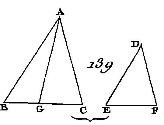 Menez la droite DF, et sur la droite AB et aux points A, B faites l'angle GAB égal à l'angle C, et l’angle ABG égal à l'angle CDF (prop. 23. I); l'angle restant CFD sera égal à l'angle restant AGB (prop. 32. I) : donc les triangles FCD, GAB sont équiangles : donc F D est à GB comme FC est à GA, et comme CD est à AB (prop. 4. VI). Construisez ensuite sur la droite BG et aux points B, G l'angle BGH égal à l'angle DFE et l'angle GBH égal à l'angle FDE ; l'angle E restant sera égal à l'angle H restant : donc les triangles FDE, GBH sont équiangles : donc FD est à GB comme FE est à GH, et comme ED est à HB (prop. 4. VI). Mais on a démontré que FD est à GB comme FC est à GA, et comme CD est à AB : donc FC est à G A comme CD est à AB, comme FE est à GH, et comme ED est à HB (prop. 11. V). Mais l'angle CFD est égal à l'angle AGB par construction, et l'angle DFE égal à l'angle BGH : donc l'angle total CFE est égal à l'angle total AGH. Par la même raison, l'angle CDE est égal à l'angle ABH, l'angle C égal à l'angle A et l'angle E égal à l'angle H : donc les figures AH, CE sont équiangles, et elles ont les côtés opposés aux angles égaux proportionnels entre eux : donc les deux figures AH, CE sont semblables (déf. 1. VI). Donc, sur la droite AB on a décrit la figure AH semblable à la figure CE et semblablement placée ; ce qu'il fallait faire. PROPOSITION XIX.THÉORÈME.Les triangles semblables sont entre eux en raison doublée des côtés homologues. Soient ABC, DEF (fig. 139) deux triangles semblables, ayant l'angle B égal à l'angle E. Supposons que AB soit à BC comme DE est à EF, de manière que le côté BC soit l'homologue du côté EF (déf. 12. V) : je dis que les triangles ABC, DEF sont entre eux en raison doublée des côtés BC, EF.