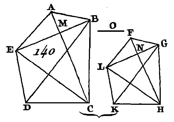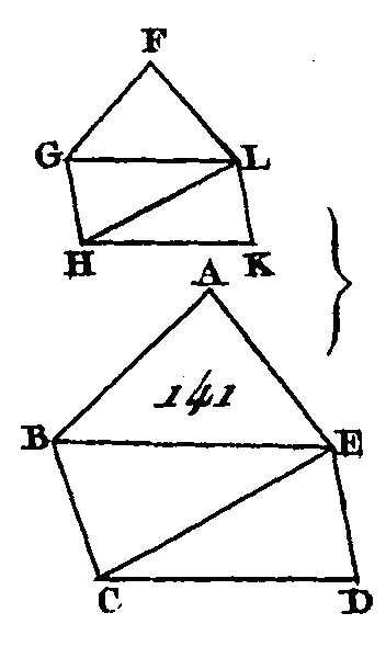 Puisque le polygone ABCDE est semblable au polygone FGHKL, l'angle BAE est égal à l'angle GFL ; mais BA est à AE comme GF est à FL : donc, puisque ces deux triangles ont un angle égal à un angle et que les côtés placés autour des angles égaux sont proportionnels, les triangles ABE, FGL seront équiangles (prop. 6. VI), et par conséquent semblables (prop. 4. VI) : donc l'angle ABE est égal à l'angle FGL; mais l'angle total ABC est égal à l'angle total FGH, à cause de la similitude des polygones : donc l'angle restant EBC est égal à l'angle restant LGH ; mais à cause de la similitude des triangles ABE, FGL, EB est à BA comme LG est à GF, et à cause de la similitude des polygones, AB est à BC comme FG est à GH, EB sera à BC comme LG est à GH (prop. 22. V), c'est-à-dire que les côtés placés autour des angles égaux EBC, LGH seront proportionnels : donc les triangles EBC, LGH sont équiangles (prop. 6. VI), et par conséquent semblables (prop. 4. VI). Par la même raison, les triangles ECD, LHK sont encore semblables : donc les polygones ABCDE, FGHKL sont divisés en triangles semblables et égaux en nombre. Je dis de plus que ces triangles sont proportionnels aux polygones, c'est-à-dire que ces triangles sont entre eux comme les antécédents ABE, EBC, ECD sont aux conséquents FGL, LGH, LHK; je dis encore que les polygones ABCDE, FGHKL sont en raison doublée des côtés homologues, c'est-à-dire en raison doublée des côtés AB, FG. Menez les droites AC, FH. Puisqu'à cause de la similitude des polygones l'angle ABC est égal à l'angle FGH, et que AB est à BC comme F G est à GH, les triangles ABC, FGH seront équiangles (prop. 6. VI) : donc l'angle BAC est égal à l'angle GFH et l'angle BCA égal à l'angle GHF. De plus, puisque l'angle BAM est égal à l'angle GFN et qu'il a été démontré que l'angle ABM est égal à l'angle FGN, l'angle restant AMB sera égal à l'angle restant FNG (prop. 32. I) : donc les deux triangles ABM, FGN sont équiangles. Nous démontrerons semblablement que les deux triangles BMC, GNH sont équiangles : donc AM est à MB comme FN est à NG, et BM est à MC comme GN est à NH (prop. 4. VI) : donc AM est à MC comme FN est à NG (prop. 23. 5); mais A M est à MC comme le triangle ABM est au triangle MBC, comme le triangle AME est au triangle EMC, car ils sont entre eux comme leurs bases (prop. 1. VI), mais un seul des antécédents est à un seul des conséquents comme tous les antécédents sont à tous les conséquents (prop. 12. V) : donc le triangle AMB est au triangle BMC comme le triangle ABE est au triangle CBE; mais AMB est à BMC comme AM est à MC : donc AM est à MC comme le triangle ABE est au triangle EBC (prop. 11. V). Par la même raison FN est à NH comme le triangle FGL est au triangle GLH ; mais AM est à MC comme FN est à NH : donc le triangle ABE est au triangle BEC comme le triangle FGL est au triangle GLH (prop. 11. V) : ou bien en échangeant les places des moyens, le triangle ABE est au triangle FGL comme le triangle BEC est au triangle GLH (prop. 16. V). Nous démontrerons semblablement, après avoir mené BD, GH, que le triangle BEC est au triangle GLH comme le triangle ECD est au triangle LHK; mais puisque le triangle ABE est au triangle FGL comme le triangle EBC est au triangle LGH et comme le triangle ECD est au triangle LHK, un des antécédents sera à un des conséquents comme tous les antécédents seront à tous les conséquents (prop. 12. V) : donc le triangle ABE est au triangle FGL comme le polygone ABCDE est au polygone FGHKL; mais les triangles ABE, FGL sont entre eux en raison doublée des côtés AB, FH ; car les triangles semblables sont en raison doublée des côtés homologues (prop. 19. 6): donc les polygones ABCDE, FGHKL sont en raison doublée des côtés homologues AB, FG. Donc les polygones semblables peuvent être divisés en un même nombre de triangles semblables et proportionnels aux polygones ; et les polygones semblables sont entre eux en raison doublée des côtés homologues ; ce qu'il fallait démontrer. COROLLAIRE I.On démontrera de la même manière que les quadrilatères semblables sont en raison doublée des côtés homologues ; mais cela a été démontré pour les triangles semblables (corol. 19. VI) : donc généralement les figures rectilignes semblables sont entre elles en raison doublée des côtés homologues. COROLLAIRE II.Si nous prenons une troisième proportionnelle O aux deux droites AB, FG, les droites AB, O seront en raison doublée des droites AB, FG (déf. 10. V) ; mais les polygones et les quadrilatères sont entre eux en raison doublée des côtés homologues, c'est-à-dire en raison doublée des côtés AB, FG ; l'on démontre cela pour les triangles ; il est donc généralement évident que si trois droites sont proportionnelles, la première et la troisième sont entre elles en raison doublée de la figure décrite sur la première, et de la figure semblable décrite semblablement sur la seconde. AUTREMENT.Nous démontrerons autrement et plus brièvement que les triangles sont proportionnels aux polygones de la manière suivante : Soient les polygones ABCDE, FGHKL (fig. 141). Menez BE, EC, GL, LH : je dis que le triangle ABE est au triangle FGL comme le triangle EBC est au triangle LGH et comme le triangle CDE est au triangle H KL.