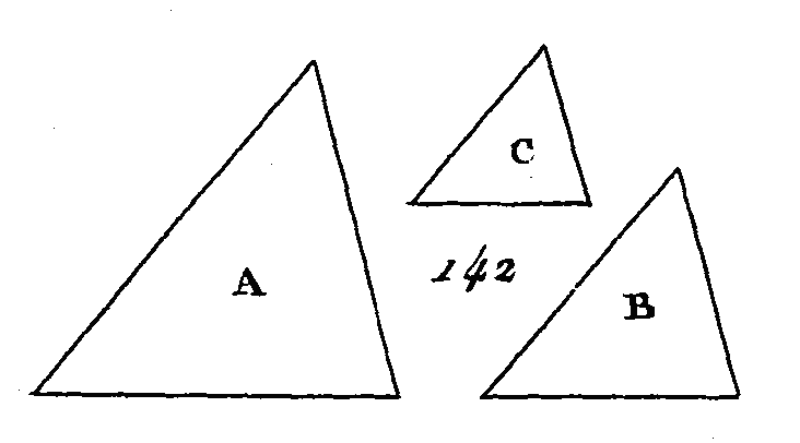 Puisque les triangles ABE, FGL sont semblables, les triangles ABE, FGL sont en raison doublée des côtés BE, GL (prop. 19. VI). Par la même raison les triangles BEC, GLH sont en raison doublée des côtés BE, GL : donc le triangle ABE est au triangle FGL comme le triangle EBC est au triangle LGH (prop. 11. V). De plus, puisque le triangle EBC est semblable au triangle LGH, les triangles EBC, LGH sont en raison doublée des droites CE,-HL (prop. 19. VI). Par la même raison les triangles ECD, LHK sont en raison doublée des droites CE, HL : donc le triangle EBC est au triangle LGH comme le triangle ECD est au triangle LHK (prop. 11. V) ; mais on a démontré que le triangle EBC est au triangle LGH comme le triangle ABE est au triangle FGL : donc le triangle ABE est au triangle FGL comme le triangle BEC est au triangle GLH et comme le triangle ECD est au triangle LHK : donc un des antécédents est à un des conséquents comme tous les antécédents sont à tous les conséquents (prop. 12. V) ; et le reste comme dans la première démonstration ; ce qu'il fallait démontrer. PROPOSITION XXI.THÉORÈME.Les figures rectilignes qui sont semblables à une même figure rectiligne sont semblables entre elles. Que chacune des figures rectilignes A, B (fig. 142) soit semblable à la figure rectiligne C : je dis que la figure rectiligne A est semblable à la figure rectiligne B.