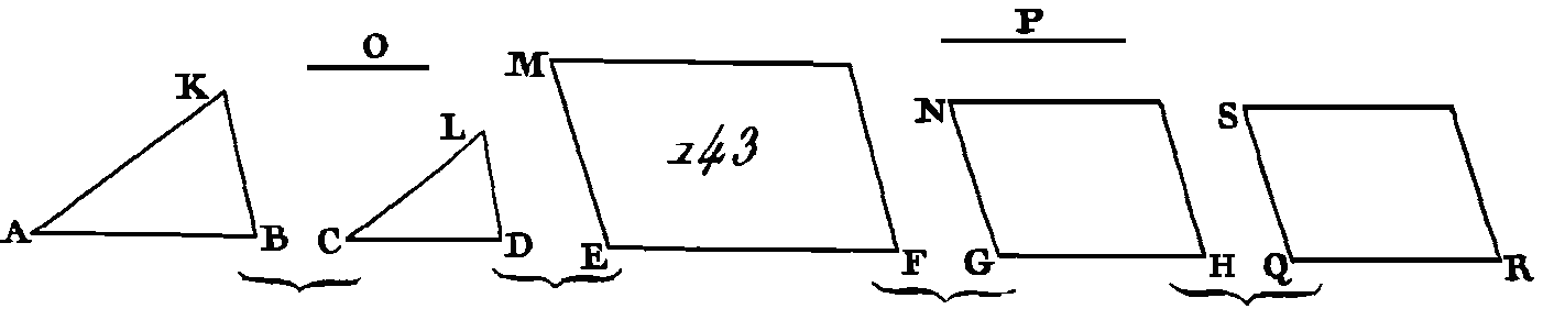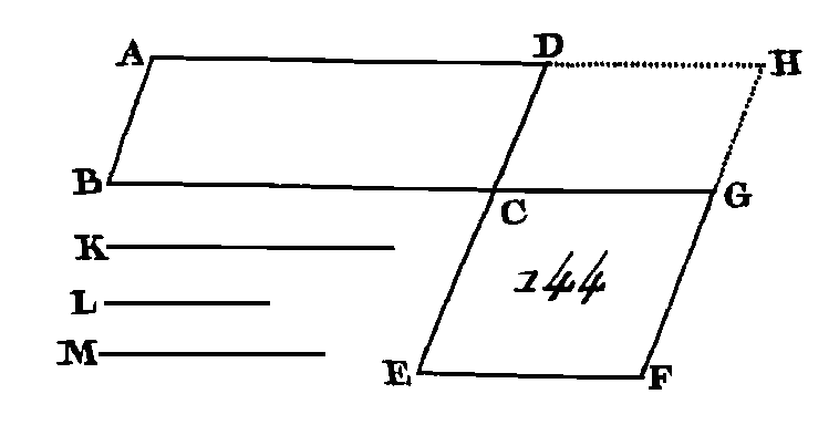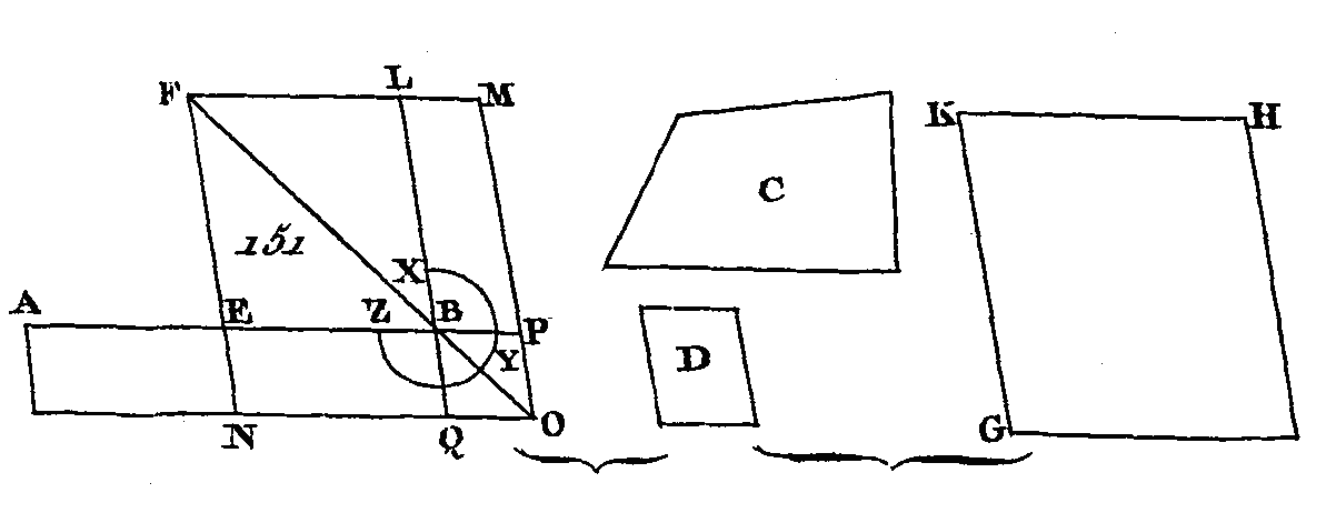 [1] Un parallélogramme est dit appliqué sur une droite lorsqu'il est décrit sur cette droite. Un parallélogramme est dit défaillant d'un parallélogramme lorsqu'il est décrit sur une partie delà base d'un autre parallélogramme, sous les mêmes angles et entre les mêmes parallèles; le parallélogramme dont il est défaillant se nomme son défaut. Soit AO le parallélogramme que l'on considère, le parallélogramme AD sera le parallélogramme défaillant et son défaut sera le parallélogramme CO. Un parallélogramme est dit excédent d'un parallélogramme lorsqu'il est décrit sur la base prolongée d'un autre parallélogramme, sous le même angle et entre les mêmes parallèles; le parallélogramme dont il surpasse le parallélogramme que l'on considère se nomme son excès. Soit AO le parallélogramme que l'on considère ; le parallélogramme AE sera le parallélogramme excédent et le parallélogramme KE sera son excès. [2] En effet, si l'on ajoute les deux proportions CB:BD::BE:BF, et BC:CD::BE:CG, et si l'on divise les antécédents par deux, on aura la proportion BC:BD+CD:: BE:BF+CG. |