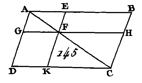 Placez la droite B C dans la direction de la droite CG; la droite DC sera placée dans la direction de CE (prop. 14. I). Achevez le parallélogramme DG; prenez une droite quelconque R, de manière que BC soit à CG comme, R est à L et que DC soit à CE comme L est à M (prop. 12. VI). Les raisons de R à L et de L à M sont les mêmes que les raisons des côtés, c'est-à-dire de BC à CG et de DC à CE; mais la raison de R à M est composée de la raison de R à L et de la raison de L à M (déf. 5. VI) : donc les droites R et L sont entre elles en raison composée des côtés ; et puisque BC est à CG comme le parallélogramme AC est au parallélogramme CH (prop. 1. VI), et que BC est à CG comme R est à L, R sera à L comme le parallélogramme AC est au parallélogramme CH (prop. 11. V). De plus, puisque DC est à CE comme le parallélogramme CH est au parallélogramme CF, et que DC est à CE comme L est à M (prop. 1. VI), L sera à M comme le parallélogramme CH est au parallélogramme CF (prop. 11. V) : donc puisqu'il a été démontré que R est à L comme le parallélogramme AC est au parallélogramme CH, et que L est à M comme le parallélogramme CH est au parallélogramme GF, K sera à M comme le parallélogramme AC est au parallélogramme C F (prop. 22. V). Mais les droites K et M sont en raison composée des côtés : donc les parallélogrammes AC, CF sont entre eux en raison composée des côtés. Donc les parallélogrammes équiangles sont entre eux en raison composée des côtés ; ce qu'il fallait démontrer. PROPOSITION XXIV.THÉORÈME.Dans tout parallélogramme, les parallélogrammes placés autour du diamètre sont semblables au parallélogramme total et semblables entre eux. Soit le parallélogramme ABCD (fig. 145) dont AC est le diamètre ; qu'autour du diamètre AC soient les parallélogrammes EG, HK : je dis que les parallélogrammes EG, HK, sont semblables au parallélogramme total ABCD et semblables entre eux.