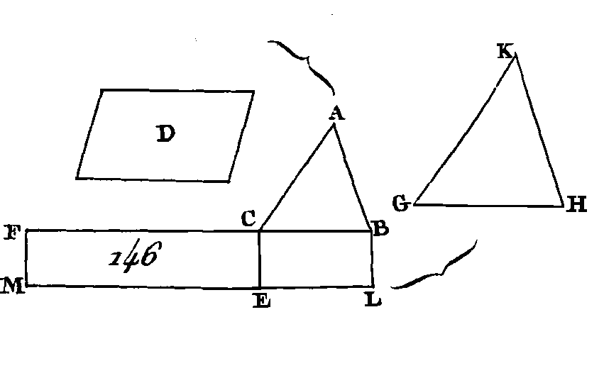 Car puisque la droite EF est parallèle à un des côtés du triangle ABC, savoir au côté BC, la droite BE sera à la droite EA comme la droite GF est à la droite FA (prop. 2. VI). De plus, puisque la droite FG est parallèle à un des côtés du triangle ACD, savoir au côté CD, la droite CF sera à la droite FA comme la droite DG est à la droite GA ; mais on a démontré que CF est à FA comme BE est à EA : donc BE est à EA comme DG est à GA (prop. 11. V) ; ajoutant les conséquents aux antécédents (prop. 18. V), BA sera à AE comme DA est à AG, et enfin en échangeant les places des moyens (prop. 16. V), BA sera à AD comme AE est à AG : donc les côtés des parallélogrammes ABCD, EG qui comprennent un angle commun BAD sont proportionnels. Puisque GF est parallèle à DC, l'angle AGF est égal à l'angle ADC (prop. 29. I), et l'angle GFA égal à l'angle DCA; mais l'angle DAC est commun aux deux triangles ADC, AGF : donc les triangles ADC, AGF sont équiangles. Les triangles ABC, AFE sont équiangles, par la même raison : donc le parallélogramme total ABCD et le parallélogramme EG sont équiangles : donc AD est à DC comme AG est à GF (prop. 4. VI) ; et AC est à CB comme AF est à FE, et de plus CB est à BA comme FE est à EA : donc puisqu'on a démontré que DC est à GA comme GF est à FA et que AC est à CB comme AF est à FE, DC sera à CB comme GF est à FE (prop. 23. V); donc les côtés dès parallélogrammes ABCD, EG qui sont autour des angles égaux sont proportionnels : donc le parallélogramme ABCD est semblable au parallélogramme EG (déf. 1. VI). Le parallélogramme ABCD est semblable au parallélogramme KH, par la même raison : donc chacun des parallélogrammes EG, HK est semblable au parallélogramme ABCD; mais les figures qui sont semblables chacune à une autre figure, sont semblables entre elles (prop. 21. VI) : donc le parallélogramme EG est semblable au parallélogramme HK. Donc, dans tout parallélogramme, les parallélogrammes placés autour du diamètre sont semblables au parallélogramme total et semblables entre eux; ce qu'il fallait démontrer. PROPOSITION XXV.PROBLÈME.Construire une figure semblable à une figure donnée et égale à une autre figure aussi donnée. Soit ABC (fig. 146) la figure donnée, à laquelle il faut construire une figure semblable, et D la figure à laquelle il faut la faire égale : il faut construire une figure qui soit semblable à la figure ABC et égale à la figure D.