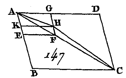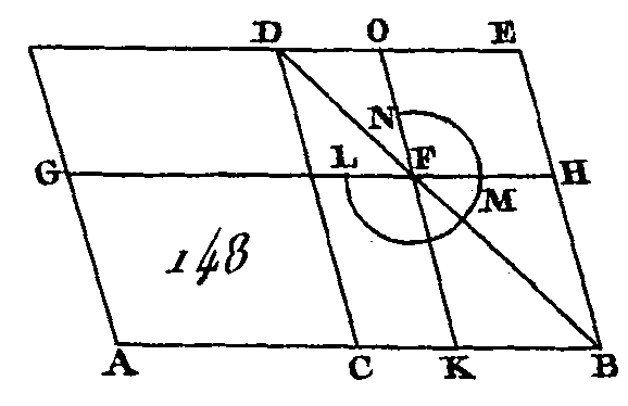 Construisez sur la droite BC un parallélogramme BE qui soit égal au triangle ABC, (prop. 44 et 45. I) et sur la droite CE et dans l'angle FCE qui est égal à l'angle CBL, construisez un parallélogramme CM égal à la figure D ; la droite BC sera dans la direction de CF, et la droite LE dans la direction de EM (prop. 14. I). Prenez une moyenne proportionnelle GH entre les droites BC, CF (prop. 13. VI), et sur cette moyenne proportionnelle G H, construisez une figure KGH semblable à la figure ABC et semblablement placée (prop. 18. VI). Puisque BC est à GH comme GH est à CF, et puisque, lorsque trois droites sont proportionnelles, la première est à la troisième comme la figure qui est construite sur la première est à la figure semblable construite sur la seconde et semblablement placée (cor. 2, prop. 20. VI), la droite BC sera à la droite CF comme le triangle ABC est au triangle KGH; mais BC est à CF comme le parallélogramme BE est au parallélogramme EF (prop. 1. VI), et le triangle ABC est au triangle KGH comme le parallélogramme BE est au parallélogramme EF : donc en changeant les places des moyens (prop. 16. V), le triangle ABC sera au parallélogramme BE comme le triangle KGH est au parallélogramme EF; mais le triangle ABC est égal au parallélogramme BE, par construction : donc le triangle KGH est égal au parallélogramme EF ; mais le parallélogramme EF est égal à la figure D : donc le triangle KGH est aussi égal à la figure D; mais le triangle KGH est semblable au triangle ABC, par construction. Donc on a construit une figure KGH semblable à la figure ABC et égale à une autre figure donnée; ce qu'il fallait faire. PROPOSITION XXVI.THÉORÈME.Si d'un parallélogramme on retranche un parallélogramme qui soit semblable au parallélogramme entier et semblablement placé, et qui ait avec lui un angle commun, ces deux parallélogrammes seront placés autour du même diamètre. Que du parallélogramme ABCD (fig. 147) on retranche le parallélogramme AEFG semblable au parallélogramme ABCD et semblablement placé et ayant avec lui un angle commun DAB : je dis que les parallélogrammes ABCD, AEFG sont placés autour du même diamètre.