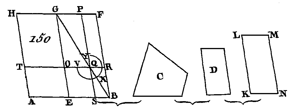 Coupez la droite AB en deux parties égales au point E (prop. 10. I), et sur EB décrivez le parallélogramme EBFG semblable au parallélogramme D et semblablement placé que lui (prop. 18. VI), et terminez le parallélogramme AG. Le parallélogramme AG est égal à la figure C, ou il est plus grand que cette figure. Si le parallélogramme AG est égal à la figure C, on a fait ce qui était proposé ; car on a appliqué sur la droite AB un parallélogramme AG égal à la figure rectiligne donné C et défaillant d'un parallélogramme EF semblable au parallélogramme D. Au contraire, si le parallélogramme HE n'est pas égal à la figure rectiligne C, ce parallélogramme sera plus grand que cette figure. Mais HE est égal à EF : donc EF est plus grand que C. Construisez le parallélogramme KLMN de manière que ce parallélogramme soit égal à l'excès du parallélogramme EF sur la figure C, et semblable au parallélogramme D et semblablement placé que lui (prop. 25. VI) ; mais EF est semblable à D : donc le parallélogramme KM sera semblable au parallélogramme EF. Que la droite LK soit l'homologue de la droite GE et la droite LM l'homologue de la droite G F. Puisque le parallélogramme EF est égal aux deux figures C, KM, le parallélogramme EF sera plus grand que le parallélogramme KM : donc la droite GE est plus grande que la droite KL, et la droite GF plus grande que la droite LM (prop. 20. VI). Faites la droite GO égale à la droite LK, et la droite GP égale à la droite LM (prop. 3. I), et terminez le parallélogramme OGPQ (prop. 31. I). Le parallélogramme OP sera égal et semblable au parallélogramme KM (prop. 26. VI) ; mais le parallélogramme KM est semblable au parallélogramme EF : donc le parallélogramme OP est semblable au parallélogramme EF (prop. 21. VI): donc ces deux parallélogrammes sont autour du même diamètre (prop. 26. VI). Soit GQB leur diamètre et décrivez la figure. Puisque le parallélogramme EF est égal aux deux figures C, KM, et que OP est égal à KM, le gnomon restant VXY sera égal à la figure restante C; et à cause que PR est égal à OS (prop. 43. I), si l'on ajoute à chacun de ces deux parallélogrammes le parallélogramme RS, le parallélogramme total P B sera égal au parallélogramme total OB. Mais OB est égal à TE (prop. 36. I), parce que le côté AE est égal au côté EB : donc TE est égal à PB : donc si on ajoute à chacun de ces deux parallélogrammes TE, PB le parallélogramme OS, le parallélogramme total TS sera égal au gnomon total VXY. Or on a démontré que le gnomon VXY est égal à C : donc le parallélogramme TS est égal à la figure rectiligne C. Donc on a appliqué sur la droite AB un parallélogramme TS qui est égal à la figure rectiligne donnée C et qui est défaillant d'un parallélogramme BS semblable à un parallélogramme D, puisque BS est semblable à PO ; ce qu'il fallait faire. PROPOSITION XXIX.PROBLÈME.Appliquer sur une droite donnée un parallélogramme qui soit égal à une figure rectiligne donnée et qui soit excédent d'un parallélogramme semblable à un autre parallélogramme donné. Soit AB (fig. 151) la droite donnée à laquelle il faut appliquer un parallélogramme qui soit égal à une figure rectiligne donnée C et qui soit excédent d'un parallélogramme semblable au parallélogramme D : il faut sur la droite AB appliquer un parallélogramme qui soit égal à la figure rectiligne C, et qui soit excédent d'un parallélogramme semblable au parallélogramme D.