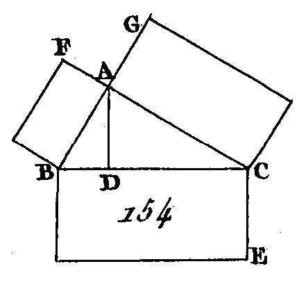 Partagez la droite AB au point C de manière que le rectangle compris sous les droites AB, BC soit égal au carré de AC (prop. 11. II). Puisque le rectangle compris sous les droites AB, BC est égal au carré de AC, AB sera à AC comme AC est à CB (prop. 17. VI) : donc la droite AB a été coupée en moyenne et extrême raison (déf. 3. VI) ; ce qu'il fallait faire. PROPOSITION XXXI.THÉORÈME.Dans les triangles rectangles, la figure construite sur le côté qui sous-tend l'angle droit est égale aux figures semblables qui sont décrites semblablement sur les côtés qui comprennent l'angle droit. Soit le triangle rectangle ABC (fig. 154) dont l'angle BAC est droit : je dis que la figure construite sur BC est égale aux ligures semblables décrites semblablement sur les côtés BA, AC. Conduisez sur BC la perpendiculaire AD.