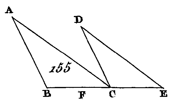 Puisque dans le triangle ABC on a conduit de l'angle A sur la base BC la perpendiculaire AD, les triangles ABD, ADC placés autour de la perpendiculaire sont semblables au triangle total ABC et semblables entre eux (prop. 8. VI). Puisque le triangle ABC est semblable au triangle ABD, CB sera à BA comme AB est à BD; mais lorsque trois droites sont proportionnelles, la première droite est à la troisième comme, la figure construite sur la première droite est à la figure semblable construite semblablement sur la seconde (prop. 2. cor. 20. VI) : donc CB est à BD comme la figure construite sur CB est à la figure semblable construite semblablement sur BA. Par la même raison, BC est à CD comme la figure construite sur BC est à la figure décrite sur CA : donc BC est à BD plus DC comme la figure construite sur BC est aux figures semblables qui sont décrites semblablement sur BA, AC ; mais BC est égal à BD plus DC[2] : donc la figure construite sur BC est égale aux figures semblables qui sont décrites semblablement sur BA, AC. Donc dans les triangles rectangles, la figure qui est construite sur le côté qui sous-tend l'angle droit est égale aux figures semblables qui sont semblablement décrites sur les côtés qui comprennent l'angle droit ; ce qu'il fallait démontrer. AUTREMENT.Puisque les figures semblables sont entre elles en raison doublée des côtés homologues (prop. 25. VI), la figure construite sur BC et celle qui est construite sur BA seront entre elles en raison doublée des côtés BC, BA ; mais le carré construit sur BC et le carré construit sur BA sont en raison doublée de BC, BA (prop. 1. cor. 20. VI) : donc la figure construite sur BC est à celle qui est construite sur BA comme le carré de BC est au carré de BA (prop. 11. V). Par la même raison la figure construite sur BC est à celle qui est construite sur CA comme le carré de BC est au carré de CA : donc la figure construite sur BC est aux figures construites sur BA, AC comme le carré de B C est aux carrés de BA et de AC. Mais le carré de BC est égal aux carrés de BA et de AC (prop. 47. I) : donc la figure construite sur BC est égale aux figures semblables qui sont semblablement décrites sur BA et sur AG; ce qu'il fallait démontrer. PROPOSITION XXXII.THÉORÈME.Si deux triangles qui ont deux cotés proportionnels à deux côtés sont disposés selon un angle de manière que leurs côtés homologues soient parallèles, les autres côtés formeront une seule droite. Soient les deux triangles ABC, DCE (fig. 155) qui aient les deux côtés BA, AC proportionnels aux deux côtés CD, DE de manière que B A soit à AC comme CD est à DE, et que AB soit parallèle à DC et AG parallèle aussi à DE : je dis que BC et CE ne formeront qu'une seule droite.