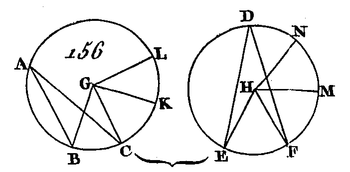 Puisque AB est parallèle à DC et que AC tombe sur ces deux droites, les angles alternes BAC, ACD sont égaux entre eux (prop. 29. I). Par la même raison, l'angle CDE est égal à l'angle ACD : donc l'angle BAC est égal à l'angle CDE ; et puisque les deux triangles ABC, ACE ont deux angles égaux en A et en D, et que les côtés qui comprennent ces deux angles égaux sont proportionnels, c'est-à-dire que BA est à AC comme CD est à DE, les triangles ABC, DCE seront équiangles (prop. 6. VI) : donc l'angle ABC est égal à l'angle DCE. Mais on a démontré que l'angle ACD est égal à l'angle BAC : donc l'angle total ACE est égal aux deux angles ABC, BAC : donc, si nous ajoutons à chacune de ces deux quantités l'angle ACB, les angles ACE, ACB seront aux angles BAC, ACB, ABC ; mais les angles BAC, ACB, ABC sont égaux à deux angles droits (prop. 32. I) : donc les angles ACE, ACB sont égaux à deux angles droits : donc avec une droite quelconque AC et au point C les deux droites BC, CE placées de différents côtés font les angles de suite ACE, ACB égaux à deux angles droits : donc les deux droites BC, CE ne forment qu'une seule droite (prop. 14. I). Donc si deux triangles qui ont deux côtés proportionnels à deux côtés sont disposés selon un angle de manière que leurs côtés homologues soient parallèles, les autres côtés formeront une seule droite ; ce qu'il fallait démontrer. PROPOSITION XXXIII.THÉORÈME.Dans les cercles égaux, les angles sont proportionnels aux arcs qu'ils comprennent, soit que ces angles soient placés aux centres ou bien aux circonférences. Il en est de même des secteurs qui sont placés aux centres. Soient les cercles égaux ABC, DEF (fig. 156), que les angles BGC, EHF soient placés à leurs centres G, H, et que les angles BAC, EDF soient placés à leurs circonférences : je dis que l'arc BC est à l'arc EF comme l'angle BGC est à l'angle EHF, comme l'angle BAC est à l'angle EDF et comme le secteur GBC est au sec-leur HEF. Faites les arcs de suite CK, KL, etc. égaux chacun à l'arc BC ; faites aussi les arcs de suite FM, MN, etc. égaux chacun à l'arc EF, et menez les rayons GK, GL, HM, UN.