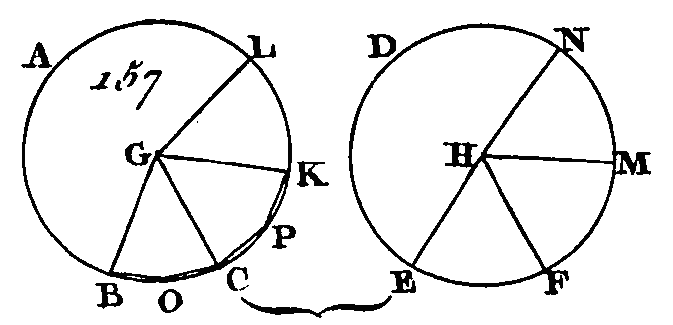 Puisque les arcs BC, CK, KL sont égaux entre eux, les angles BGC, CGH, KGL sont aussi égaux entre eux (prop. 27. III) : donc l'arc BL est multiple de Tare BC autant de fois que l'angle BGL est multiple de l'angle BGC. Par la même raison, l'arc EN est multiple de l'arc EF autant de fois que l'angle EHN est multiple de l'angle EHF. Donc si l'arc BL est égal à l'arc EN, l'angle BGL sera égal à l'angle EHN (prop. 27. III), si l'arc BL est plus grand que l'arc EN, l'angle BGL sera plus grand que l'angle EHN, et si l'arc BL est plus petit que l'arc EN, l'angle BGL sera plus petit que l'angle EHN. Ayant donc quatre quantités, savoir les arcs BC, EF et deux angles AGC, BHF, on a pris des équimultiples de l'arc BC et de l'angle BGL, savoir, l'arc BL et l'angle BGL; on a pris aussi des équimultiples de l'arc EF et de l'angle EHF, savoir, l'arc EN et l'angle EHN ; mais on a démontré que si l'arc BL surpasse l'arc EN, l'angle BGL surpassera l'angle EHN; que si l'arc BL est égal à l'arc EN, l'angle BGL sera égal à l'angle EHN, et que si Parc BL est plus petit que l'arc EN, l'angle BGL sera plus petit que l’angle EHN : donc l'arc BC est à l'arc EF comme l'angle BGC est à l'angle EHF (déf. 5. V); mais l'angle BGC est à l'angle EHF comme l'angle BAC est à l'angle EDF (prop. 15. V), car ils sont doubles les uns des autres (prop. 20. III) : donc l'arc BC est à l'arc EF comme l'angle BGC est à l'angle EHF, et comme l'angle BAC est à l'angle EDF. Donc dans des cercles égaux, les angles sont proportionnels aux arcs, soit que ces angles soient placés aux centres ou bien aux circonférences ; ce qu'il fallait démontrer. Je dis de plus que l'arc BC est à l'arc EF comme le secteur GBC est au secteur HEF. Menez les droites BC, CK (fig. 157), et ayant pris sur les arcs BC, CK, les points O, P, conduisez les droites BO, OC, CP, PK.