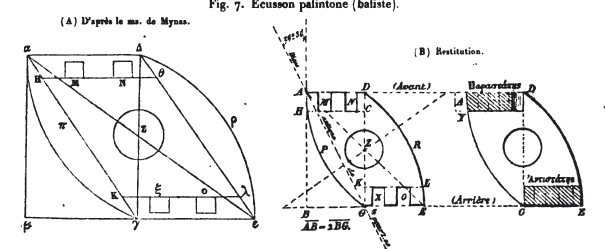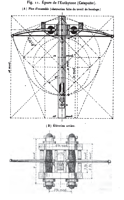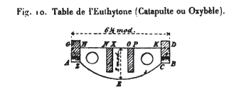 [90] Il semble tout d'abord que cette grande longueur ne convienne qu'à l’Εύθύτονον. Mais le Παλίντονον (voir fig. 9), ayant ses bras au repos presque parallèles au plan de tir, montre, dans la longueur de la corde, un nouvel argument de plus en faveur du battement extérieur particulier au système.
