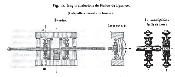 Telle est l'ingénieuse solution due à Philon de Byzance. Elle ne paraît pas avoir été connue de Vitruve, qui n'a décrit que le système des barillets de torsion, les seuls usités alors, probablement, dans l'artillerie romaine.