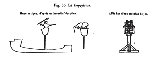 [122] Ainsi les modèles d'engins à ressorts de Ctésibius et de Philon étaient euthytones. Les ressorts remplacèrent, dans l’oxybèle du temps, les faisceaux défibres, et l’effort balistique fut transporté au talon des battants. Ceux-ci faisaient saillie à droite et à gauche de la cage. La chirobaliste emprunta au χαλκότονον le principe des ressorts, mais au bronze elle substitua l'acier. En outre, les battants de l'engin d'Héron étaient palintones, système plus puissant, plus ramassé et mieux approprié que les précédents au service en campagne, où les combattants se trouvaient d'ordinaire serrés les uns contre les autres.