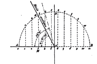 L'énoncé de Philon est très obscur. Il connaissait peut-être si bien l'épure de l’écusson, qu'il a cru être compris sans plus de précision de style. En pratique, diviser une demi-circonférence en ii parties égales, est un procédé inadmissible. Philon ne dit point d'ailleurs que les 11 parties soient égales. J'ai trouvé qu'elles le sont, à la condition d'être comptées, non sur la demi-circonférence, mais sur le diamètre. En élevant, par les points de division, des perpendiculaires au diamètre, on obtient 11 segments de demi-cercle, qui sont les 11 parties que Philon avait en vue. D'un autre côté, le rayon aboutissant au sommet de l'ordonnée n° 4 (τέσσαρα μέρη) doit fournir l'angle biais cherché. En le calculant, on trouve α = 74° 11, valeur évidemment trop grande. Mais, au lieu de τέσσαρα μέρη, si on lit τρία μέρη, on obtient α = 62° 58', qui diffère de 63° 26' de moins de ½ degré. En effet, le diamètre étant représenté par 11 (fig. 52), le rayon vaut 5 ½. La distance OM du centre à la division n° 3, comptée à partir de la circonférence, est de 2 ½. Dans le cercle de rayon = 5 ½, elle représente le cosinus du biais cherché. On a donc cos α = (2 ½) / (5 ½) ou cos α = 0,454545..., d’où α = 62° 58'. La différence avec 63° 26' donnerait à peine 0,02 cm, sur la petite base d'un écusson de 1 mètre. L'altération de τρία en τέσσαρα dans le mss. n'a rien d'invraisemblable, même si le nombre primitif était figuré par Γ, qu'on a pu lire aisément Δ.