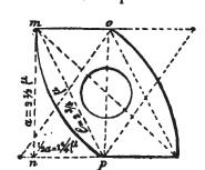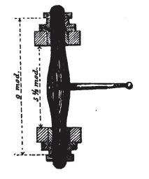 [82] La hauteur s'entend ici de l’épaisseur ou dimension verticale de l'écusson. Sous le biais normal, de ½ de base pour 1 de hauteur, la quantité mp = 2,75 correspond à la longueur mn=2,46 pour l'écusson, soit 1/8 de la longueur totale (19 modules) de la machine (voir fig. 53).