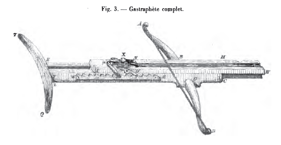 167. L'ensemble de l'engin se nomme Gastraphète.[36] C'est en effet la pression du ventre qui détermine la mise au bandé de la corde archère.[37]