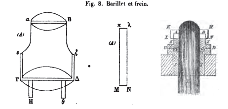 [130] Philon critique ensuite l'idée primitive de Ctésibius, qui remplaça d'abord l'organe névrotone par un faisceau analogue de rubans métalliques juxtaposés. Cet essai échoua, mais Philon en explique mal la cause. Il est certain que la réduction du ressort total à deux lames arc-boutées fut un progrès considérable, dû en principe à Philon de Byzance et porté à une haute perfection dans la Chirobaliste d'Héron d'Alexandrie.