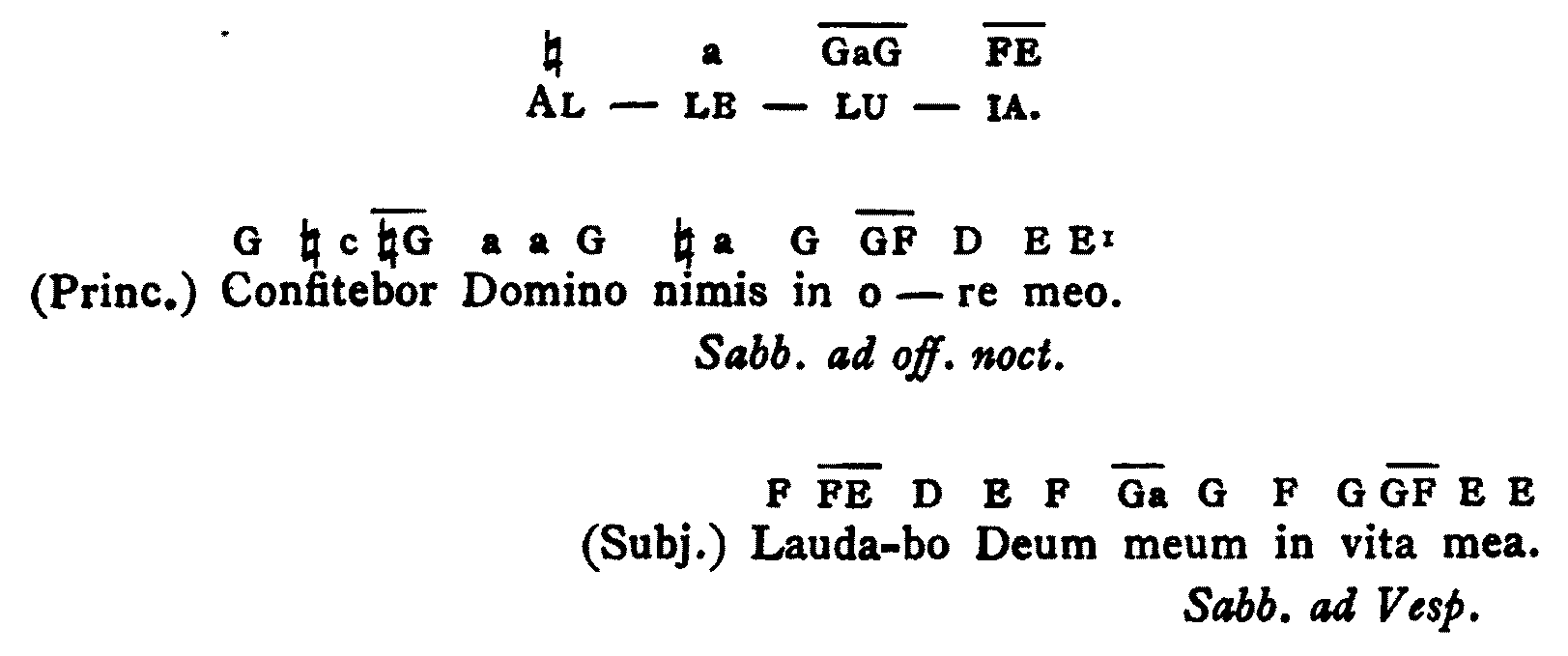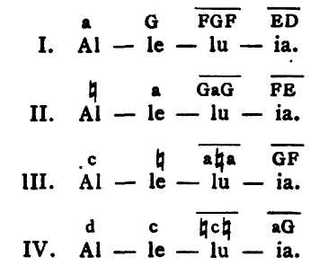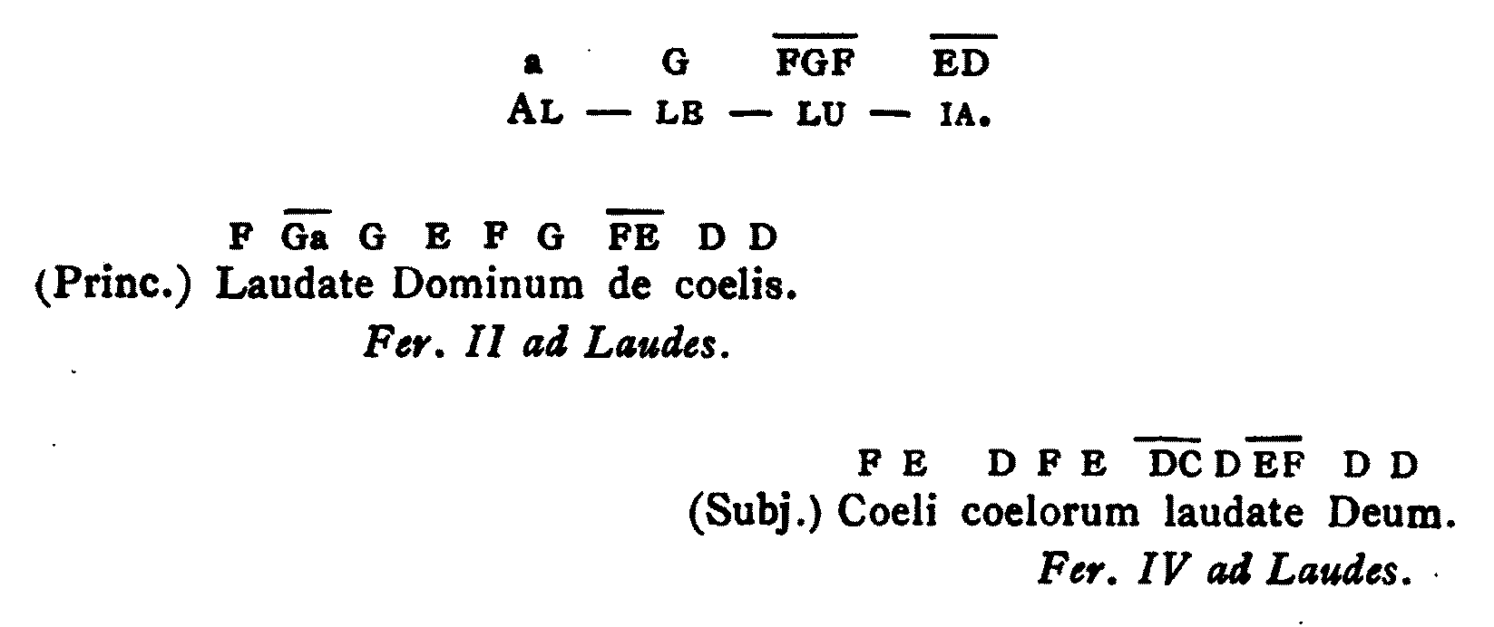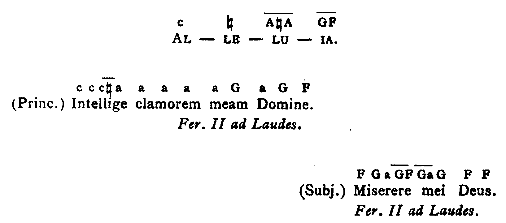 De cette manière on se sert de mélodies d'un usage courant pour reconnaître la propriété des divers modes. Les authentiques, partant des cordes supérieures, se terminent en descendant vers les finales; les plagaux commencent et se terminent sur les finales sans atteindre aux cordes aiguës. (Gerbert, Scriptores, t. I, p. 152 et suiv.) Au lieu d'antiennes connues, les Grecs, et à leur imitation les Latins, employaient aussi, afin de se remémorer les inflexions caractéristiques de chacun des doubles modes, huit mélodies composées ad hoc sur des syllabes conventionnelles.