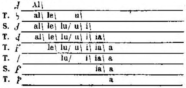 Ad hunc modum consuetis utuntur modulis ad investigandam toni cujusque vim, eadem ratione compositis: quorum principales quique a suis sonis superioribus ordientes desinunt in finales, minores vero in finalibus et inchoant et consistunt, nec superiorem attingunt locum..........................