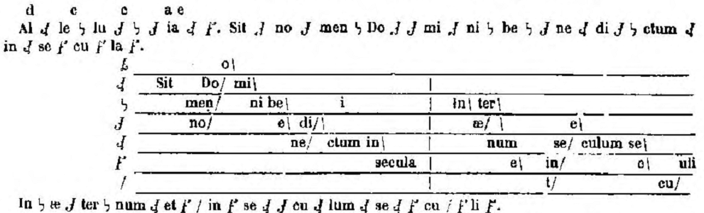 En chantant la première formule mélodique, vous reconnaîtrez que la prépondérance du premier son final (ré) engendre le caractère du premier mode (protus). Quand vous chanterez la formule II, vous sentirez que le deuxième mode (deuterus) est gouverné par le deuxième son final (mi). Si vous prenez la formule III, vous verrez de même dans le troisième son final (fa) résider la puissance du troisième mode (tritus). Que si vous entonnez la formule IV, vous vous apercevrez que le quatrième mode (tétrardus) procède du 4e son final (sol). Conséquemment à la première formule mélodique s'adapteront tous les chants du protus et de son subordonné (ou plagal); de même à la seconde les chants du deuterus, à la troisième ceux du tritus, à la quatrième ceux, du tétrardus, conformément aux exemples donnés ci-dessous pour chaque mode. Mélopée du protus authentique et de son plagal :