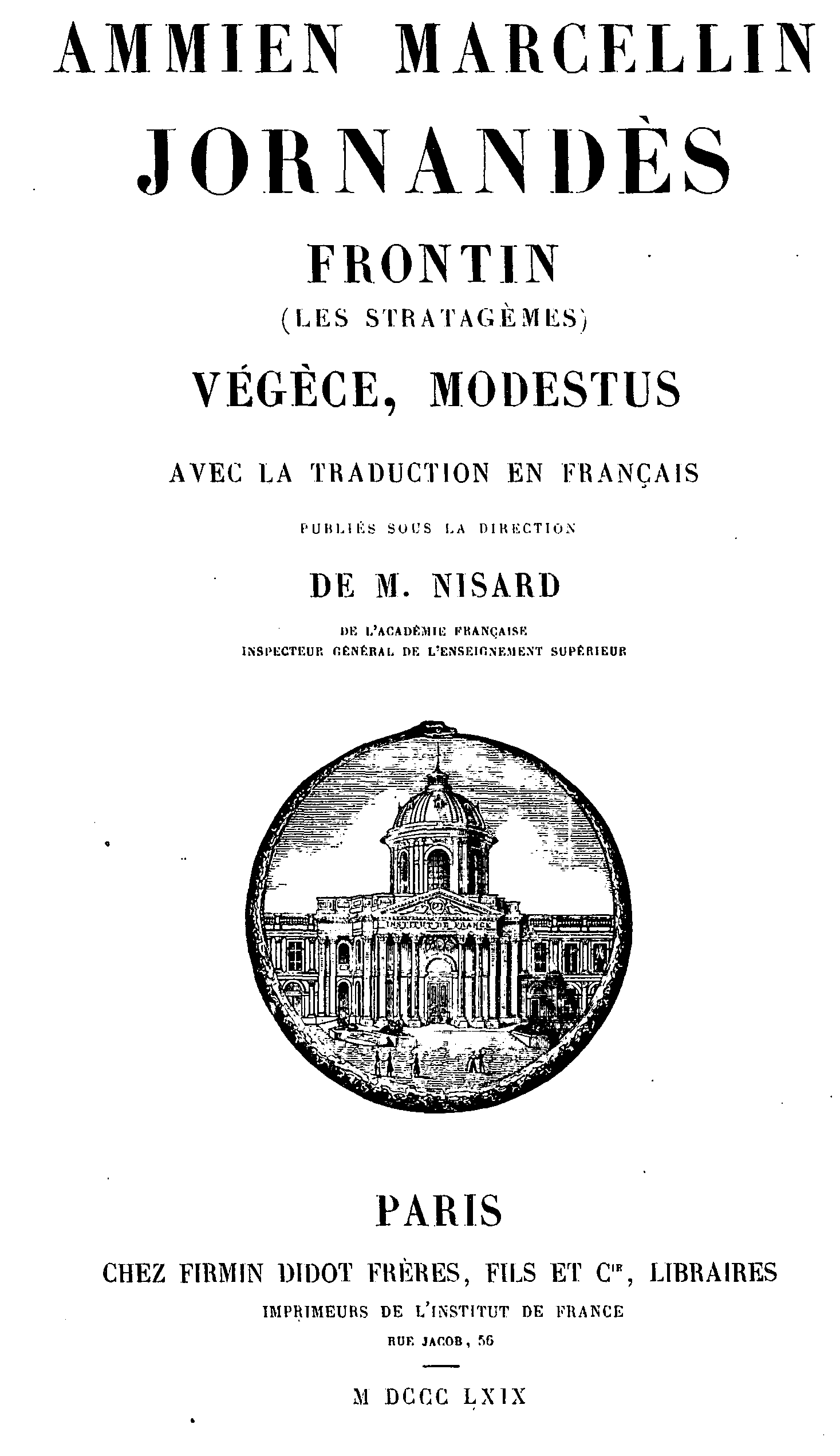 MODESTUSNOTICE SUR MODESTUS.Tout ce que l’on sait de Modestus, c’est qu’il composa pour l’empereur Tacite, vers l’année 275, son Précis des termes de la milice (Libellus de vocabulis rei militaris). Il s’est trouvé, il est vrai, des savants qui, sans tenir compte du nom de l’empereur à qui ce livre est dédié, en ont rapproché la date de plus d’un siècle, et l’ont déclaré postérieur celui de Végèce, que Modestus aurait, suivant eux, copié. Leur principal argument est que Végèce, qui a nommé, dans le titre même de son ouvrage, les auteurs à qui il a fait des emprunts, comme Caton, Celse, Trajan, Adrien et Frontin, n’y fait pas mention de Modestus. Mais il n’est pas certain que ce titre soit de Végèce lui-même : et cela fut-il prouvé, il a bien pu ne pas vouloir mettre à côté de ces noms-là celui d’un écrivain aussi peu considérable que Modestus. S’il est vrai que l’un des deux ait copié l’autre, laissons donc à Modestus le mérite, d’ailleurs assez médiocre en raison de l’oeuvre, d’avoir été le modèle, ce qui se réduit au simple bénéfice du temps, et à Végèce l’avantage d’avoir pu être le copiste, ce qui n’est pas en effet lui faire tort ni injure, puisque, de son propre aveu, son livre n’est qu’un recueil d’extraits de différents auteurs, c’est-à-dire, une pure compilation. Mais il est possible aussi qu’ils aient copié tous deux un écrivain dont l’ouvrage ne serait pas parvenu jusqu’à nous. Il n’y a rien à dire du style de Modestus, qui est suffisamment clair dans tous les endroits que les scribes ne sont pas parvenus à embrouiller. Les plus anciennes éditions de son livre, souvent réimprimé depuis dans le recueil des écrivains militaires, furent publiées à Venise en 1471 et 1474, la première sans nom d’auteur, sous ce titre : De disciplina militari; la seconde sous celui-ci De re militari. Nous reproduisons ici celle qui fut donnée par Scriverius (1604, in 4°). PRECIS DES TERMES DE LA MILICE.A TACITE AUGUSTE. § 1. La milice se divise en trois parties cavalerie, infanterie, marine. Il est une partie de la cavalerie qu’on désigne par le terme figuré d’aile, parce qu’elle couvre le corps de bataille sur les flancs, à peu près comme feraient des ailes; et on l’appelle vexillation, de nom des voiles ou petites flammes volantes qui lui servent d’enseignes. Il y a une autre sorte de cavalerie qui est nommée légionnaire, parce qu’elle fait corps avec la légion. L’infanterie a été elle-même divisée en deux parties, c’est-à-dire, en légionnaire et en auxiliaire. Cette dernière était recrutée parmi les alliés ou confédérés. Le nom de légion (legio) vient de legere (choisir), et indique le soin et la fidélité qu’on exige de ceux qui choissent les soldats.[1] § 2. Il faut mener très souvent les soldats au champ de Mars; les faire défiler l’un après l’autre, suivant l’ordre de rôle, et ne les mettre d’abord que sur un rang, queue qu’en soit l’Etendue, en ayant soin qu’ils soient parfaitement alignés, et qu’il y ait entre chaque une distance égale, et conforme aux règles. Ensuite on leur commandera de doubler le rang vivement, et de façon que, dans le même instant, le second rang qu’ils forment réponde exactement au premier. A un troisième commandement, ils doubleront encore le rang, et se mettront rapidement sur quatre de hauteur. De ce carré long ils formeront ensuite le triangle, qu’on appelle coin; disposition qui est ordinairement d’une grande utilité dans les batailles.[2] § 3. Les auxiliaires pie l’on mène au combat viennent de divers pays, et diffèrent par les moeurs et par la discipline; il n’y a entre eux aucun lien d’affection ; autres sont les coutumes, autre est la manière de combattre. Il est par conséquent difficile de remporter une prompte victoire avec des troupes qui, avant de combattre, ne marchent pas d’accord. On joignit toujours les auxiliaires aux légions dans les batailles, comme troupes légères; et s’ils ne faisaient pas la principale force des armées, on les comptait du moins pour un renfort utile.[3] § 4. On trouve dans tous les auteurs que chaque consul ne menait contre les ennemis les plus redoutables que deux légions, renforcées d’auxiliaires fournis par les alliés : tant l’on comptait sur la force de la discipline dans ces deux légions, pour quelque guerre que ce fut.[4] § 5. Chaque légion doit être de dix cohortes. La première cohorte est au-dessus des autres, et par le nombre et par la qualité des soldats qui doivent être des gens bien nés et élevés dans les lettres : elle est en possession de l’aigle, qui est toujours l’enseigne principale dans les armées romaines, et qui commande à toute la légion. Les images des empereurs, que chacun révère comme des marques présentes de la divinité, sont aussi sous la garde de cette cohorte. Elle est de onze cent cinq fantassins et de cent trente deux cavaliers cuirassés, et s’appelle cohorte milliaire. C’est la tête de la légion; c’est aussi par elle que l’on commence à former la première ligne, quand on se prépare à combattre. La seconde cohorte contient cinq cent soixante fantassins et soixante-six cavaliers, et s’appelle cohorte quingentaire (de cinq cents). La troisième cohorte contient aussi cinq cent soixante fantassins et soixante-six cavaliers; mais on la compose de soldats vigoureux et éprouvés, parce qu’elle occupe le centre de la première ligne. La quatrième cohorte a cinq cent cinquante-cinq fantassins et soixante-six cavaliers. La cinquième a également cinq cent cinquante-cinq fantassins et soixante-six cavaliers; mais elle demande surtout des soldats courageux, parce qu’on la place à la gauche, comme la première à la droite: ces cinq cohortes forment donc la première ligne. La sixième cohorte se compose de cinq cent cinquante-cinq fantassins et d