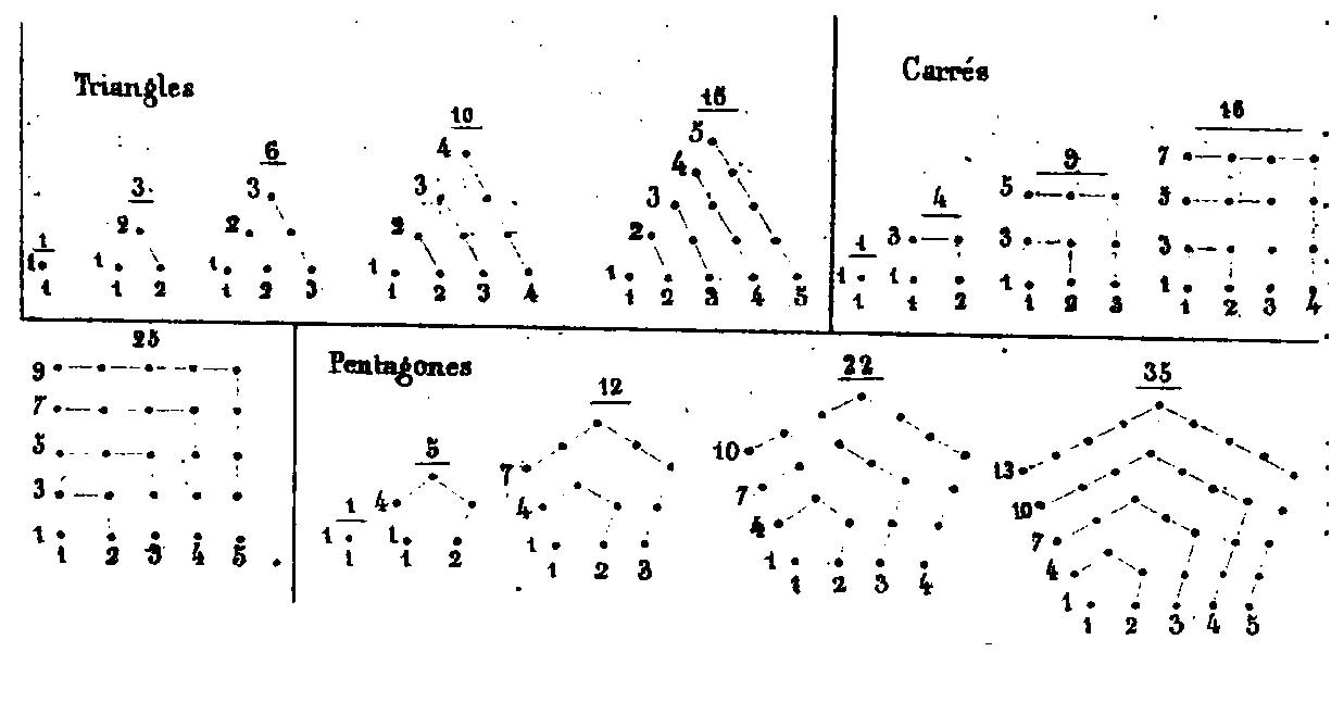 Je les reproduis ici pour les triangles, les carrés et les pentagones, en joignant ensemble par de légers traits les points appartenant à chacun des nombres composants, afin de mettre en évidence ces nombres, qui, en s'ajouta ni, forment chaque nombre polygone. Les nombres de la série naturelle sont écrits sous le coté inférieur ; les nombres composants, on différences, sont écrits le long du côté adjacent vers la gauche; les nombres polygones suit écrits au-dessus de chaque figure: On aurait des figures analogues pour les hexagones, heptagones, etc.