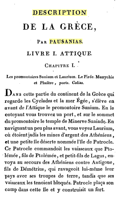 Les promontoires Sunium et Laurium. Le Pirée. Munychie et Phalère, ports. Colias. 1. DANS cette partie du continent de la Grèce qui regarde les Cyclades et la mer Égée, s'élève en avant de l'Attique le promontoire Sunium. En le côtoyant vous trouvez un port, et sur le sommet du promontoire le temple de Minerve (Athéna) Suniade. En naviguant un peu plus avant, vous voyez Laurium, où étaient jadis les mines d'argent des Athéniens, et une petite île déserte nommée l'île de Patrocle. Ce Patrocle commandait les vaisseaux que Ptolémée, fils de Ptolémée, et petit-fils de Lagus, envoya au secours des Athéniens contre Antigone, fils de Démétrius, qui ravageait lui-même leur pays avec ses troupes de terre, tandis que ses vaisseaux les tenaient bloqués. Patrocle plaça son camp dans cette île et y construisit un fort. 2. Le Pirée était déjà anciennement un bourg, mais il n'y avait point de port avant que Thémistocle fût archonte, et Phalère était alors le port des Athéniens; c'est là en effet que la mer est le plus près de la ville. Ménésthée partit, dit-on, de Phalère pour se rendre au siège de Troie, et Thésée s'y était embarqué auparavant pour aller donner à Minos satisfaction de la mort d'Androgée. Thémistocle, lorsqu'il fut archonte, trouvant que le Pirée était bien plus commode pour les navigateurs, et offrait d'ailleurs trois ports au lieu d'un seul qu'il y avait à Phalère, y fit les constructions nécessaires pour le rendre praticable, et les loges destinées à recevoir les vaisseaux y étaient encore de mon temps. Le tombeau de Thémistocle est vers le plus grand de ces ports, car on dit que les Athéniens s'étant repentis de leur injustice à son égard, ses os furent apportés de Magnésie par ses parents. Il paraît que ses enfants revinrent aussi à Athènes, et ils placèrent dans le Parthénon un tableau représentant Thémistocle. 3. L'enceinte consacrée à Jupiter (Zeus) et à Minerve (Athéna) est ce que le Pirée offre de plus remarquable. Jupiter (Zeus), tient son sceptre d'une main, une Victoire de l'autre, et Minerve (Athéna) tient une pique ; ces deux statues sont en bronze. On y voit le tableau où Arcésilas a peint Léosthène et ses enfants : ce Léosthène à la tête des Athéniens et de tous les autres Grecs, ayant défait les Macédoniens, d'abord dans la Béotie, ensuite au-delà des Thermopyles, les obligea de se renfermer dans Lamie, de l'autre côté du mont Éta. Un long portique sert de marché à ceux qui demeurent près de la mer, (car il y a un autre marché pour ceux qui sont plus éloignés du port). On voit derrière ce portique, deux statues, représentant Jupiter (Zeus), et le Peuple, tous deux debout; elles sont de Léocharès. Sur le bord de la mer est un temple de Vénus (Aphrodite) que Conon fit bâtir après la victoire navale qu'il remporta sur les Lacédémoniens, vers Guide, dans la Chersonèse de la Carie. Les Gnidiens ont en effet la plus grande vénération pour Vénus (Aphrodite), qui a plusieurs temples chez eux. Celui de Vénus (Aphrodite) Doritis est le plus ancien ; celui de Vénus (Aphrodite) Acrée a été bâti ensuite; le plus moderne de tous est celui de Vénus (Aphrodite) nommée Euplée par les Gnidiens, mais plus généralement connue sous le nom de Vénus (Aphrodite) de Gnide. 4. Les Athéniens ont à Munychie un autre port et un temple de Diane (Artémis) Munychia ; et à Phalère, comme je l'ai déjà dit, un troisième port, avec un temple de Cérès (Déméter) auprès. On y voit aussi un temple de Minerve (Athéna) Sciras; un peu plus loin, un temple de Jupiter (Zeus), et des autels érigés aux dieux inconnus, aux héros, aux fils de Thésée et à Phalérus, qui fit avec Jason le voyage de Colchos, disent les Athéniens. Androgée, fils de Minos, y a pareillement un autel qu'on nomme l'autel du héros, mais ceux qui cherchent à connaître mieux que les autres, les antiquités du pays, savent qu'il est dédié à Androgée. 5. Le promontoire Colias est à vingt stades de Phalère ; c'est-là qu'après la défaite des Mèdes, les débris de leur escadre furent jetés par les flots. On y voit la statue de Vénus (Aphrodite) Colias et celles des Génétyllides, déesses qui sont, je crois, les mêmes que celles qui portent le nous de Gennaïdes chez les Phocéens de l'Ionie. Sur la route de Phalère à Athènes est un temple qui n'a plus ni portes ni toit : il fut brûlé, dit-on, par Mardonius, fils de Gobryas. Si la statue qu'on y voit est, comme on le dit, un ouvrage d'Alcamène, on conçoit pourquoi elle n'a pas été mutilée par Mardonius.