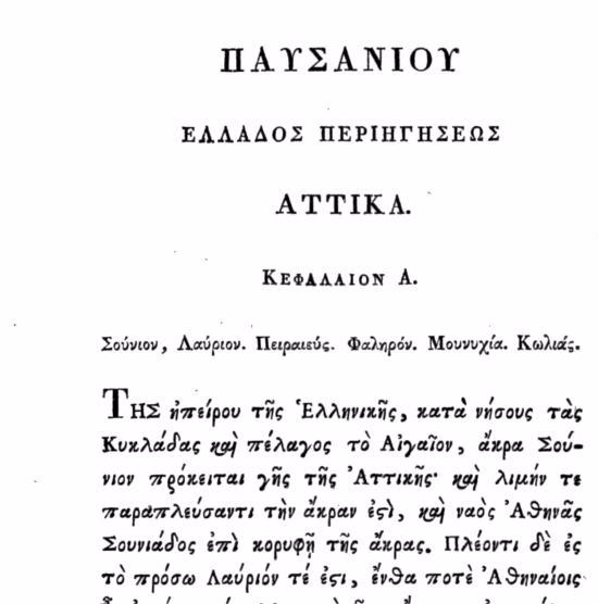ΚΕΦΑΛΑΙΟΝ A' Σούνιον, Λαύριον. Πειραιεύς. Φαληρόν. Μουνυχία. Κωλιάς. (1) Τῆς ἠπείρου τῆς Ἑλληνικῆς, κατὰ νήσους τὰς Κυκλάδας καὶ πέλαγος τὸ Αἰγαῖον, ἄκρα Σούνιον πρόκειται γῆς τῆς Ἀττικῆς· καὶ λιμήν τε παραπλεύσαντι τὴν ἄκραν ἐστὶ, καὶ ναὸς Ἀθηνᾶς Σουνιάδος ἐπὶ κορυφῇ τῆς ἄκρας. Πλέοντι δὲ ἐς τὸ πρόσω Λαύριόν τέ ἐστιν, ἔνθα ποτὲ Ἀθηναίοις ἦν ἀργύρου μέταλλα, καὶ νῆσος ἔρημος οὐ μεγάλη, Πατρόκλου καλουμένη· τεῖχος γὰρ ᾠκοδομήσατο ἐν αὐτῇ καὶ χάρακα ἐβάλετο Πάτροκλος, ὃς τριήρεσιν ὑπέπλει ναύαρχος Αἰγυπτίαις, ἃς Πτολεμαῖος ὁ <Πτολεμαίου> τοῦ Λάγου τιμωρεῖν ἔστειλεν Ἀθηναίοις, ὅτε σφίσιν Ἀντίγονος ὁ Δημητρίου στρατιᾷ τε αὐτὸς ἐσβεβληκὼς ἔφθειρε τὴν χώραν καὶ ναυσὶν ἅμα ἐκ θαλάσσης κατεῖργεν. (2) Ὁ δὲ Πειραιεὺς δῆμος μὲν ἦν ἐκ παλαιοῦ· πρότερον δὲ, πρὶν ἢ Θεμιστοκλῆς Ἀθηναίοις ἦρξεν, ἐπίνειον οὐκ ἦν· Φαληρὸν δέ, ταύτῃ γὰρ ἐλάχιστον ἀπέχει τῆς πόλεως ἡ θάλασσα, τοῦτό σφισιν ἐπίνειον ἦν· καὶ Μενεσθέα φασὶν αὐτόθεν ταῖς ναυσὶν ἐς Τροίαν ἀναχθῆναι, καὶ τούτου πρότερον Θησέα δώσοντα Μίνῳ δίκας τῆς Ἀνδρόγεω τελευτῆς. Θεμιστοκλῆς δὲ ὡς ἦρξε (Τοῖς τε γὰρ πλέουσιν ἐπιτηδειότερος ὁ Πειραιεὺς ἐφαίνετό οἱ προκεῖσθαι καὶ λιμένας τρεῖς ἀνθ᾽ ἑνὸς ἔχειν τοῦ Φαληροῖ) τοῦτό σφισιν ἐπίνειον εἶναι κατεσκευάσατο· καὶ νεὼς καὶ ἐς ἐμὲ ἦσαν οἶκοι, καὶ πρὸς τῷ μεγίστῳ λιμένι τάφος Θεμιστοκλέους. Φασὶ γὰρ μεταμελῆσαι τῶν ἐς Θεμιστοκλέα Ἀθηναίοις, καὶ ὡς οἱ προσήκοντες τὰ ὀστᾶ κομίσαιεν ἐκ Μαγνησίας ἀνελόντες. Φαίνονται δὲ οἱ παῖδες οἱ Θεμιστοκλέους, καὶ κατελθόντες καὶ γραφὴν ἐς τὸν Παρθενῶνα ἀναθέντες, ἐν ᾗ Θεμιστοκλῆς ἐστι γεγραμμένος. (3) Θέας δὲ ἄξιον τῶν ἐν Πειραιεῖ μάλιστα Ἀθηνᾶς ἐστι καὶ Διὸς τέμενος· χαλκοῦ μὲν ἀμφότερα τὰ ἀγάλματα, ἔχει δὲ ὁ μὲν σκῆπτρον, καὶ Νίκην, ἡ δὲ Ἀθηνᾶ δόρυ· ἐνταῦθα Λεωσθένην, ὃς Ἀθηναίοις καὶ τοῖς πᾶσιν Ἕλλησιν ἡγούμενος Μακεδόνας ἔν τε Βοιωτοῖς ἐκράτησε μάχῃ, καὶ αὖθις ἔξω Θερμοπυλῶν, καὶ βιασάμενος ἐς Λάμιαν κατέκλεισε τὴν ἀπαντικρὺ τῆς Οἴτης, τοῦτον τὸν Λεωσθένην, καὶ τοὺς παῖδας ἔγραψεν Ἀρκεσίλαος. Ἔστι δὲ τῆς στοᾶς τῆς μακρᾶς, ἔνθα καθέστηκεν ἀγορὰ τοῖς ἐπὶ θαλάσσῃ (καὶ γὰρ τοῖς ἀπωτέρω τοῦ λιμένος ἐστὶν ἑτέρα), τῆς δὲ ἐπὶ θαλάσσης στοᾶς ὄπισθεν ἑστᾶσι Ζεὺς καὶ Δῆμος, Λεωχάρους ἔργον. πρὸς δὲ τῇ θαλάσσῃ Κόνων ᾠκοδόμησεν Ἀφροδίτης ἱερόν, τριήρεις Λακεδαιμονίων κατεργασάμενος περὶ Κνίδον τὴν ἐν τῇ Καρικῇ χερρονήσῳ. Κνίδιοι γὰρ τιμῶσιν Ἀφροδίτην μάλιστα, καί σφισιν ἔστιν ἱερὰ τῆς θεοῦ, τὸ μὲν γὰρ ἀρχαιότατον Δωρίτιδος· μετὰ δὲ τὸ Ἀκραίας· νεώτατον δὲ ἣν Κνιδίαν οἱ πολλοί, Κνίδιοι δὲ αὐτοὶ καλοῦσιν Εὔπλοιαν. (4) Ἔστι δὲ καὶ ἄλλος Ἀθηναίοις ὁ μὲν ἐπὶ Μουνυχίᾳ λιμὴν καὶ Μουνυχίας ναὸς Ἀρτέμιδος, ὁ δὲ ἐπὶ Φαληρῷ, καθὰ καὶ πρότερον εἴρηταί μοι, καὶ πρὸς αὐτῷ Δήμητρος ἱερόν. Ἐνταῦθα καὶ Σκιράδος Ἀθηνᾶς ναός ἐστι καὶ Διὸς ἀπωτέρω, βωμοὶ δὲ θεῶν τε ὀνομαζομένων Ἀγνώστων καὶ ἡρώων καὶ παίδων τῶν Θησέως καὶ Φαληροῦ· τοῦτον γὰρ τὸν Φαληρὸν Ἀθηναῖοι πλεῦσαι μετὰ Ἰάσονός φασιν ἐς Κόλχους. Ἔστι δὲ καὶ Ἀνδρόγεω βωμὸς τοῦ Μίνω, καλεῖται δὲ Ἥρωος. Ἀνδρόγεω δὲ ὄντα ἴσασιν, οἷς ἐστιν ἐπιμελὲς τὰ ἐγχώρια σαφέστερον ἄλλων ἐπίστασθαι. (5) Ἀπέχει δὲ καὶ σταδίους εἴκοσιν ἄκρα Κωλιάς· ἐς ταύτην, φθαρέντος τοῦ ναυτικοῦ τοῦ Μήδων, κατήνεγκεν ὁ κλύδω