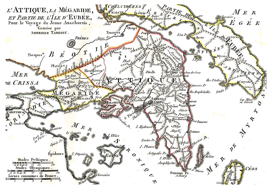 Psyttalie. Anthémocritus, Scyros devin. Céphisodore. 1. Pour en revenir à mon sujet, on voit à Salamine, d'une part, un temple d'Diane (Artémis), de l'autre, le trophée de la victoire que les Grecs durent aux conseils de Thémistocle, fils de Néoclès, et le temple de Cychrée. Les Athéniens racontent que durant le combat naval contre les Mèdes, un serpent se montra au milieu de leurs vaisseaux et que l'oracle leur dit que c'était le héros Cychrée. 2. Devant Salamine est une île nommée Psyttalie où débarquèrent, dit-on, environ quatre cents barbares. Les Grecs y passèrent après leur victoire et les tuèrent tous. Excepté quelques statues en bois du Dieu Pan, d'un travail très grossier, cette île n'offre rien de remarquable. 3. En allant d'Athènes à Éleusis par la voie sacrée, on trouve le tombeau du Hérault Anthémocritus, que les Athéniens avaient envoyé dire aux Mégaréens de ne pas cultiver à l'avenir le terrain consacré aux grandes déesses. Les Mégaréens le tuèrent, et cet attentat impie ne leur a pas encore été pardonné par ces divinités ; car ils sont, de tous les Grecs les seuls pour lesquels l'Empereur Adrien n'ait rien fait. 4. Après le cippe consacré à la mémoire d'Anthémocritus, vous trouvez le tombeau de Molossus l'un des généraux que les Athéniens choisirent pour aller dans l'Eubée au secours de Plutarque. Sciros, petit canton voisin, a pris son nom de Scirus qui vint de Dodone pour assister comme devin les Eleusiniens alors en guerre avec Érechthée. Il fit bâtir à Phalère l'ancien temple de Minerve (Athéna) Scyras. Il fut tué dans le combat contre Érechthée, et les Éleusiniens l'enterrèrent près d'un torrent, qui, ainsi que le canton, a pris le nom de ce héros. 5. On voit près de là le tombeau de Céphisodore, qui se trouvant à la tête du peuple, opposa une résistance très vigoureuse à Philippe, fils de Démétrios, roi de Macédoine ; il ménagea aux Athéniens l'alliance d'Attale, roi de Mysie ; de Ptolémée, roi d'Égypte ; des Étoliens, des Rhodiens et des Crétois ; 6. mais les secours de l'Égypte, de la Mysie et de l'île de Crète, se faisant attendre, et les vaisseaux qui formaient la seule force des Rhodiens ne pouvant pas être d'une grande utilité contre les Hoplites Macédoniens, Céphisodore passa en Italie avec quelques autres Athéniens, et alla implorer l'assistance des Romains ; ceux-ci leur ayant envoyé une armée et un général, abaissèrent tellement la puissance de Philippe et des Macédoniens, que Persée, fils de Philippe, fut dans la suite privé de son royaume et même emmené captif à Rome. Ce Philippe était fils de Demetrius ; Demetrius avait fait entrer le royaume de Macédoine dans sa maison, en tuant, comme nous l'avons dit précédemment, Alexandre, fils de Cassandre.
