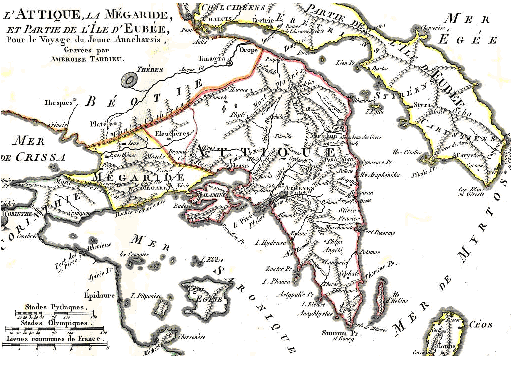 Les petits bourgs de l'Attique se sont formés comme au hasard. Voici ce qu'ils offrent de plus remarquable. On voit chez les Alimusiens,[366] un temple de Cérès (Déméter) Thesmophore et de sa fille, à Zoster,[367] près de la mer, des autels dédiés à Minerve (Athéna), à Apollon, à Diane (Artémis) et à Latone. C'est là, disent les gens du pays, que Latone sentant ses couches approcher, délia sa ceinture, ce qui fit donner à cet endroit le nom de Zoster ; ils ne disent cependant pas qu'elle y soit accouchée. Les Prospaltiens[368] ont aussi un temple de Cérès (Déméter) et de sa fille. Il y en a un de la Mère des dieux à Anagyre. On rend à Céphale un culte très solennel aux Dioscures, que les habitants nomment les grands dieux. On voit à Prasies[369] un temple d'Apollon, où arrivent, dit-on, les prémices des Hyperboréens. Ce peuple les transmet aux Arimaspes, qui les remettent aux Issédons ; les Scythes les reçoivent de ces derniers, et les portent à Sinope,[370] d'où elles arrivent à Prasies, par le moyen des Grecs ; de là, les Athéniens les portent à Délos. Ces prémices sont enveloppées dans de la paille de froment, et personne ne sait en quoi elles consistent. On voit aussi à Prasies le tombeau d'Erysichthon, qui revenant des fêtes de Délos, mourut dans la traversée. J'ai déjà dit que Cranaüs, roi d'Athènes, fut détrôné par Amphictyon, son gendre ; il s'enfuit, dit-on, avec ses troupes à Lamptrée où il mourut ; il y fut enterré, et les habitants de Lamprée[371] montrent encore maintenant le tombeau de Cranaüs. Ion, fils de Xuthus, demeura aussi quelque temps chez les Athéniens, et les commanda dans une guerre contre les Éleusiniens ; son tombeau est à Potamus,[372] du moins suivant la tradition vulgaire. On voit à Phlyes[373] les autels d'Apollon Dionysodotos, de Diane (Artémis) Sélasphoros,[374] de Bacchus (Dionysos) Anthius, des nymphes Isménides[375] et de la Terre, nommée dans le pays la Grande Déesse ; et dans un autre temple les autels de Cérès (Déméter) Anèsidôras, de Jupiter (Zeus) Ctésias, de Minerve (Athéna) Tithrone,[376] de Coré Protogone (la fille première née), et des déesses connues sous le nom de Semnæ (Sévères). A Myrrhinonte,[377] Colænis a une statue en bois, et les Athmonéens[378] adorent Diane (Artémis) Amarysia. J'ai questionné les exégètes du pays sur ces deux noms ; comme ils ne m'ont rien appris de positif, voici ce que j'ai conjecturé. Amarynthe est une ville de l'Eubée, où l'on adore Diane (Artémis) Amarysia, les Athéniens eux-mêmes célèbrent en son honneur une fête avec non moins de pompe que les Eubéens, et c'est de là qu'est venu, je pense, le surnom de celle que les Athéniens ont en vénération. Quant à Colænis, qu'on adore à Myrrhinonte, je crois qu'elle a pris son nom de Colænus.[379] J'ai déjà dit que suivant la tradition de plusieurs bourgs, il y avait eu des rois dans l'Attique avant Cécrops, et les Myrrhinusiens prétendent que Colænus en était un. Les Acharniens[380] forment aussi un bourg, ils rendent un culte à Apollon Agyéus et à Hercule. Ils ont chez eux un autel de Minerve (Athéna) Hygiéa ; ils donnent à cette déesse le surnom d'Hippia ; et à Bacchus (Dionysos) celui de Melpomène (chantant), ainsi que celui de Cissus (lierre), et ils disent que leur pays est le premier où cette plante ait paru.