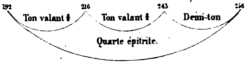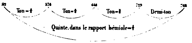 Maintenant, nous dirons que le système de quarte a été ainsi nommé, par la raison qu'il est composé de deux tons et un demi-ton, c'est-à-dire de quatre termes ou sons, composition qui, le mettant en quelque sorte à l'unisson des divers éléments dont l'âme est formée, est ainsi la cause des justes proportions de son harmonie. Une figure va rendre sensible ce crue nous disons.