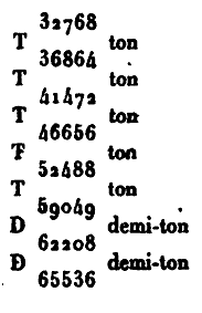 Le diapason est composé de 8 cordes,[12] et c'est pourquoi on le nomme diapason ; car l'instrument le plus simple est un instrument à 8 cordes, et celui qui a un plus grand nombre de cordes comprend l'octocorde dans sa composition. C'est donc parce que le rapport double se trouve dans la totalité des cordes de cet instrument qu'on l'a nommé diapason. Or cette consonance se compose de cinq tous et deux demi-tons ; et on l'obtient comme il suit. Je cherche la cinquième puissance de 8, afin de pouvoir placer à la suite 5 rapports sesquioctaves, et j'obtiens 32768. En effet, la première puissance est 8, la deuxième 64, la troisième 512, la quatrième 4096, et la cinquième ledit nombre 32768. Or le nombre qui est à celui-ci dans le rapport sesquioctave, ou qui en est distant d'un ton, est 36864 ; puis le nombre qui est à ce dernier dans le même rapport est 41472 ; après celui-ci vient de même 46656 ; puis, après celui-ci, 52488 ; puis enfin, après ce dernier, 59049. Ensuite, multipliant par la valeur du demi-ton, on a 62208 ; puis, multipliant encore de même,[13] on a enfin 65536, qui est au nombre primitif 32768 dans le rapport double, Suit le tableau du tout.
