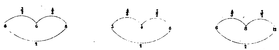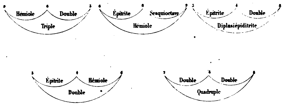 Mais pourquoi le rapport de 4 à 3 s'appelle-t-il quarte, et pourquoi celui de 3 à 2 s'appelle-t-ii quinte ? c'est ce que l'on va voir. Commençons, pour cela, par prendre deux cordes d'égale épaisseur ; et, soit au moyen de poids, soit au moyen de chevalets, donnons à l'une une tension représentée par 3, et à l'autre une tension représentée par 4 ; puis frappons ces deux cordes : nous aurons bien le rapport épitrite, puisque le rapport ainsi nommé n'est autre que le rapport de 4 à 3, et que ce dernier est bien aussi celui de la corde dont la tension est 4 à la corde dont la tension est 3. Ensuite prenons une troisième corde, et donnons-lui une tension encore plus forte et justement assez élevée pour être à la première dans le rapport de 3 à 2 : cela fait, nous trouverons que la tension de cette dernière est à celle de la seconde corde dans le rapport sesquioctave.