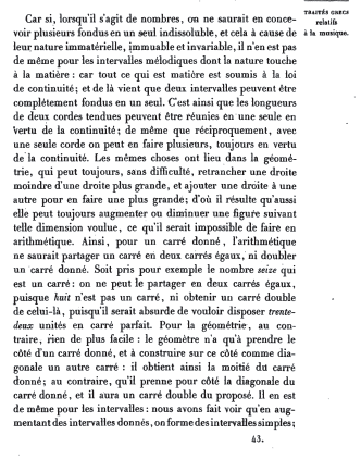 Car si, lorsqu’il s’agit de nombres, on ne saurait en concevoir plusieurs fondus en un seul indissoluble, et cela à cause de la musique, leur nature immatérielle, immuable et invariable, il n’en est pas de même pour les intervalles mélodiques dont la nature touche à la matière: car tout ce qui est matière est soumis à la loi de continuité; et de là vient que deux intervalles peuvent être complètement fondus en un seul. C’est ainsi que les longueurs de deux cordes tendues peuvent être réunies en une seule en vertu de la continuité; de même que réciproquement, avec une seule corde on peut en faire plusieurs, toujours en vertu de la continuité. Les mêmes choses ont lieu dans la géométrie, qui peut toujours, sans difficulté, retrancher une droite moindre d’une droite plus grande, et ajouter une droite à une autre pour en faire une plus grande; d’où il résulte qu’aussi elle peut toujours augmenter ou diminuer une figure suivant telle dimension voulue, ce qu’il serait impossible de faire en arithmétique. Ainsi, pour un carré donné, l’arithmétique ne saurait partager un carré en deux carrés égaux, ni doubler un carré donné. Soit pris pour exemple le nombre seize qui est un carré: on ne peut le partager en deux carrés égaux, puisque huit n’est pas un carré, ni obtenir un carré double de celui-là, puisqu’il serait absurde de vouloir disposer trente-deux unités en carré parfait. Pour la géométrie, au contraire, rien de plus facile : le géomètre n’a qu’à prendre le côté d’un carré donné, et à construire sur ce côté comme diagonale un autre carré : il obtient ainsi la moitié du carré donné; au contraire, qu’il prenne pour côté la diagonale du carré donné, et il aura un carré double du proposé. Il en est de même pour les intervalles: nous avons fait voir qu’en augmentant des intervalles donnés, on forme des intervalles simples; et nous avons expliqué pourquoi ils sont simples: c’en est assez sur ce point relatif à la musique.