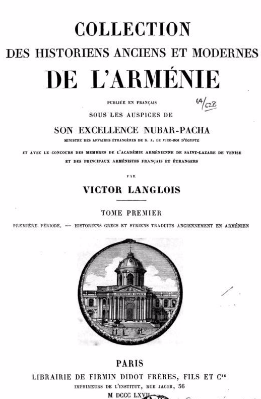 [1] Thotig, vingtième abbé du monastère de Sourp Garabed, expulsa tous les Syriens de son église, abolit les règlements qu’avaient faits ses prédécesseurs, et proscrivit même leur langue, en forçant les moines placés sous sa juridiction, à n’employer que l’idiome arménien dans les usages ordinaires de la vie et dans la liturgie de l’Eglise. [2] Cette notice sur l’ouvrage de Jean Mamigonien a été rédigée d’après celle que le P. Karékin a insérée dans son Histoire de la littérature arménienne (en arm.), p. 316 et suiv. [3] Cf. Moïse de Khorène, Hist. d’Arm., liv. II, ch. 91. Panégyriques de saint Grégoire et Vies des Saints arm., sub nom. Grigoris. [4] Cf. Vartan, Géographie, dans Saint-Martin, Mém. sur l’Arm., t. II. p. 430-431. [5] Cf. Zénob de Glag. [6] Jean Mantagouni, auteur d’homélies célèbres, dont le texte a été imprimé à Venise, au monastère arménien de Saint-Lazare. Cf. Lequien, Oriens Christ., t. 1, 1380. — Sukias de Somal, Quadro, p. 30. — Karékin, Hist. de la litt. arm., p. 218 et suit. [7] Cf. sur la fixation de l’ère arménienne les savantes recherches du P. Surmélian (Traité du calend. arm. — Venise, Saint-Lazare, en arm.) qui ont été mises à profit dans l’ouvrage intitulé: Recherches sur la chronologie arménienne (Paris, 1859). — Le point initial de l’ère arménienne est fixé au 11 juillet de l’année 552 de notre ère. [8] Moïse II, d’Eghivart, dans le canton d’Arakadzodn, occupa le siège patriarcal d’Arménie depuis l’an 551 jusqu’à l’an 581. Moïse, qui était très avancé en âge, avait pris pour coadjuteur Verthanès. [9] Abraham I, évêque du pars des Reschdouni, originaire du canton d’Abahouni, succéda à Moïse II, et occupa le siège patriarcal de l’an 594 à l’an 600. [10] Gomidas, successeur de Jean III, né à Aghtsits dans le canton d’Arakadzodn, était évêque de la satrapie des Mamigoniens, quand on l’appela sur le siège pontifical d’Arménie en 617. Il l’occupa jusqu’en 625. [11] Sébéos, Hist. d’Héraclius, ch. 25. [12] Montagne de la province d’Ararat. — Cf. Indjidji, Arm anc., p. 406. [13] Cette défense remontait à saint Grégoire l’Illuminateur, ainsi qu’on peut le voir dans l’Histoire de Zénob de Glag. [14] Cf. sur cette localité de la province de Douroupéran. Indjidji, Arm. ans., p. 96 et suiv. [15] Cf. Jean Catholicos, Htst. d’Arm., ch. IX, p. 56- 57 de la trad. fr. de Saint-Martin. — C’était une tradition répandue parmi les Arméniens, que Chosroès I avait adopté le christianisme. Jean Mamigonien attribué par erreur cette conversion à Chosroès II Parviz, fils d’Hormisdas, que Maurice, empereur de Constantinople, aida à reconquérir ses Etats contre l’usurpateur Bahram Tchoubin. [16] Cf. sur ces événements Théophylacte Simocatta, liv. IV, ch. 3-15; V, 1-13. — Théophane, p. 221 et suiv. — Cédrénus, t. I, p. 395-397, — Zonaras, Annal., t. II, liv. XIV, p. 74-75. [17] Théoph. Simmoc., liv. VI, ch. 15. — Théophane, p. 244-272. — Cédrénus, t. I. p. 405-420. — Zonaras, Annal., t II. liv. XIV, 82-85. [18] Cf. Zénob de Glag qui parle de l’érection de ce monument élevé après la bataille gagnée par les arméniens chrétiens sur les idolâtres de Daron. [19] Nous avons supprimé une longue prière, où les sept religieux offrent leur vie à Dieu en holocauste, peur l’assurer le ciel. [20] Vartan mentionne, dans sa Géographie, la sépulture de ces sept martyrs (Saint-Martin, Mém., t. II, p. 428-431. [21] Cf. Indjidji, Arm. anc., p. 108. [22] Idem [23] Le mot Gori signifie, en arménien, « un canal, un conduit d’eau. » Nous ne saurions dire si cet ethnique renferme une allusion au passage du fleuve d’Aradzani par les chevaux des soldats perses. [24] Cf. plus haut, ch. I. [25] Cf. Indjidji, Arm. anc., p. 108. [26] Cette forteresse de l’Euphratèse est appelée aussi Cargar. (Cf. St-Martin, Mém. sur l’Arm., t. I, p. 193.) [27] Cf. Indjidji, Arm. anc., p. 109. [28] Cette phrase forme un jeu de mots en arménien kaïl veut dire « loup » et khaïl, « pas ». Le verbe khaïlel a signification de « aller, marcher ». [29] L’aïp ou a arménien est négatif comme l’a grec, et sour veut dire « glaive »; or a-sour signifierait donc sans glaive. [30] Ce chant, qui n’était pas connu jusqu’à présent, et n’a pas encore été signalé par les savants, mérite d’être recueilli. Les chants d’une époque aussi ancienne sont fort rares, et celui-ci est assurément un des plus anciens que nous connaissions. [31] Quelques mss. orthographient ce mot sous la forme Grehn. [32] Mogdoun selon plusieurs mss. [33] Quelques mss. disent par le canal des Mardes. [34] L’orthographe de ce nom est différente dans tous les mss.; ainsi on trouve les variantes Hedank, Aïdz-san et Aïdzda. [35] Quelques mss. donnent cet ethnique sous la forme de Gouran. [36] Quelques mss. orthographient ce nom sous les formes Phatigav, Phantig. [37] Var. Phoïalig. [38] Var. Haïrguerd.